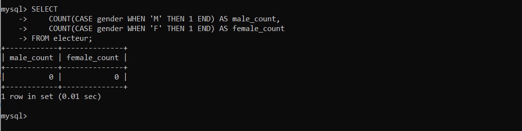 Using the CASE statement in each COUNT will compile only the statistics of the respective gender. We have zero in both cases, because our table does not hold any entry for now.
