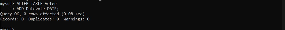 • Add a "Datevote" column representing the current date to the "Voter" table.
