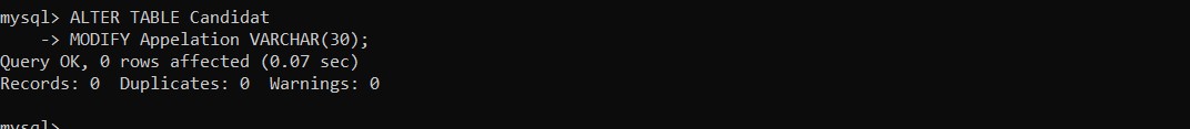• Expand the "Appelation" column of the "Candidat" table to 30 characters.