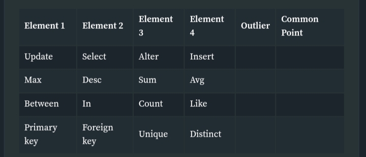 From the screenshot above, the elements included in the first row are Update, Select, Alter, and Insert.