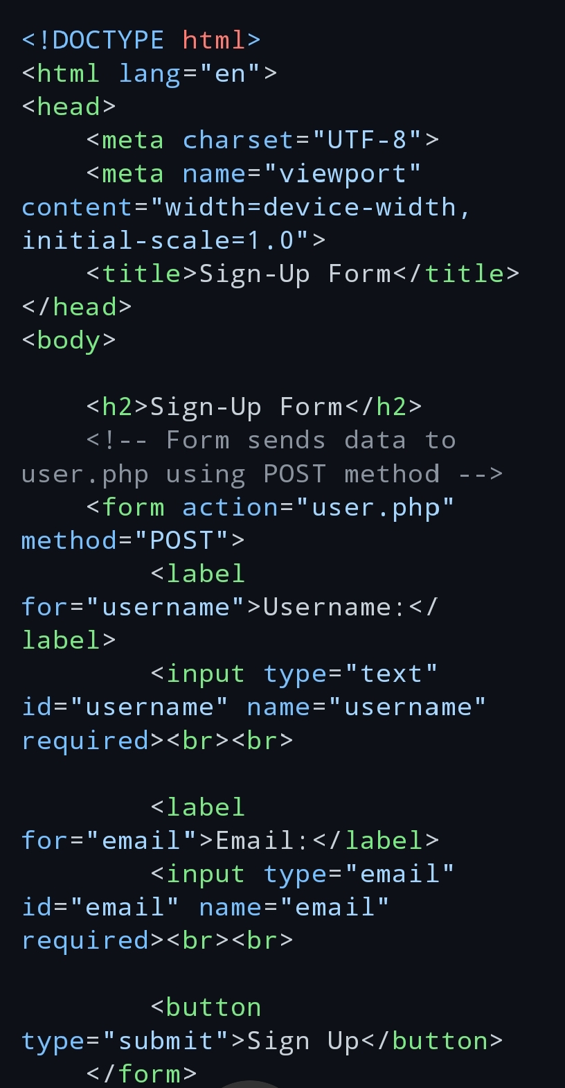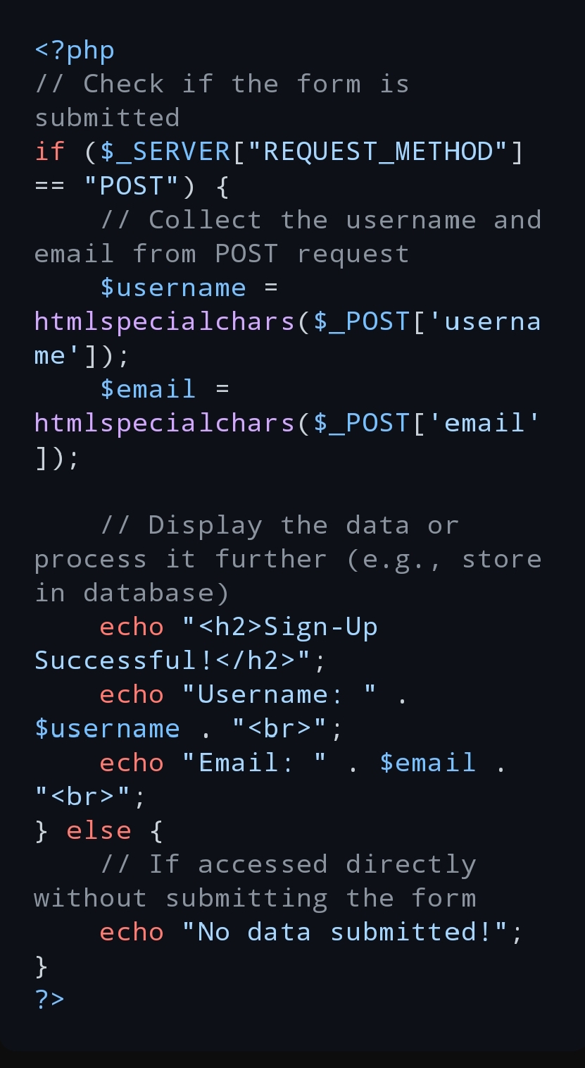 <?php // Check if The Forms is Submitted if ($_SERVER,["REQUEST_METHOD"] == "POST") { // Collect The Username, And email From POST Request, $username = htmlspecialchars($_POST['Username']); $email = htmlspecialchars($_POST['email']);// Display the data or Process, it further (e.g., store in database)