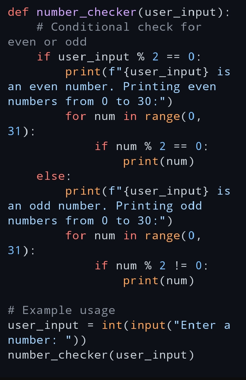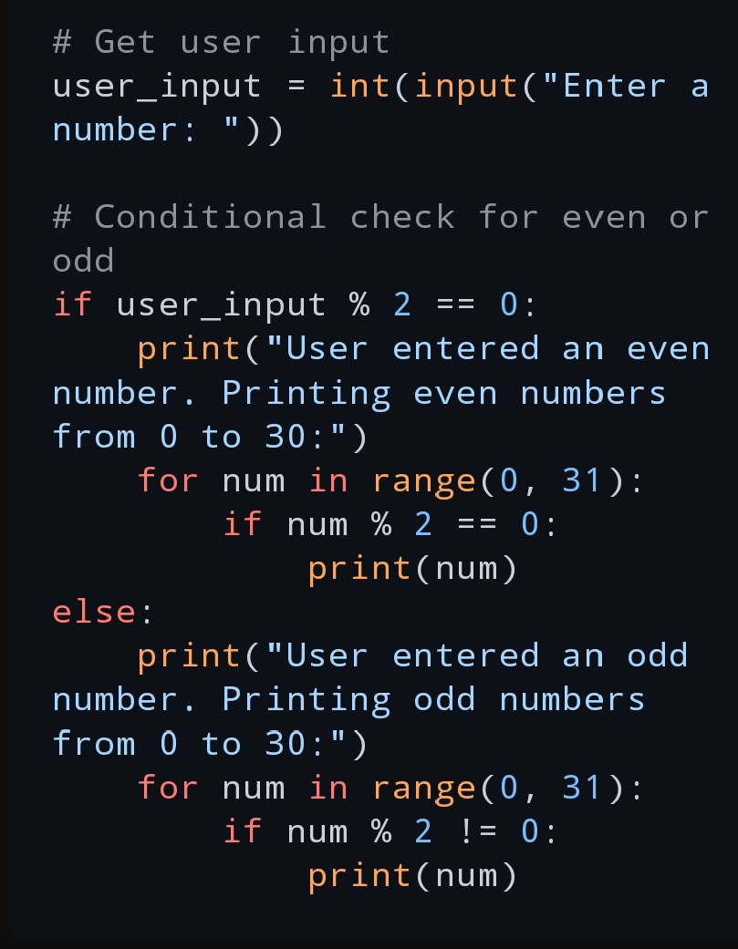 - Printing Odd Numbers: If The input is odd the loop Prints odd Numbers From the 0 to 30.