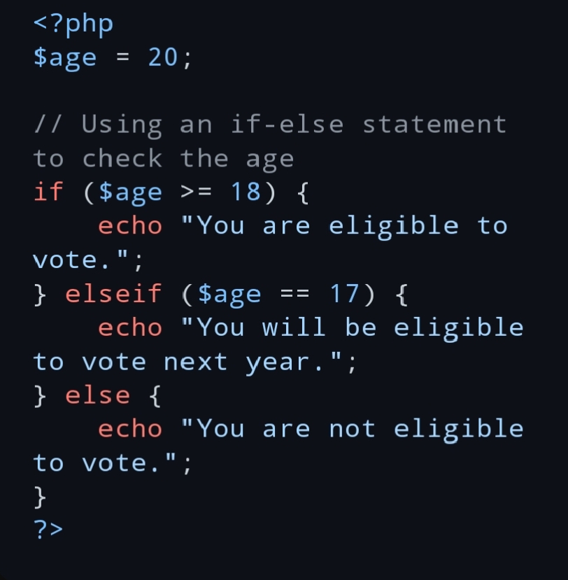 The elseif Block is Checked if the first Condition is false. Here, it checks if $age equals 17, and if so it prints "You will be Eligible to Vote next year."