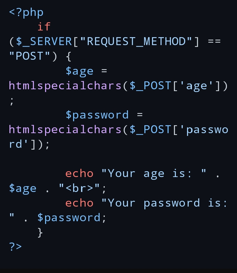 <?php if ($_SERVER["REQUEST_METHOD"] == "POST") { $age = htmlspecialchars($_POST['age']); $password = htmlspecialchars($_POST['password']); echo "Your age is: " . $age . "<br>";