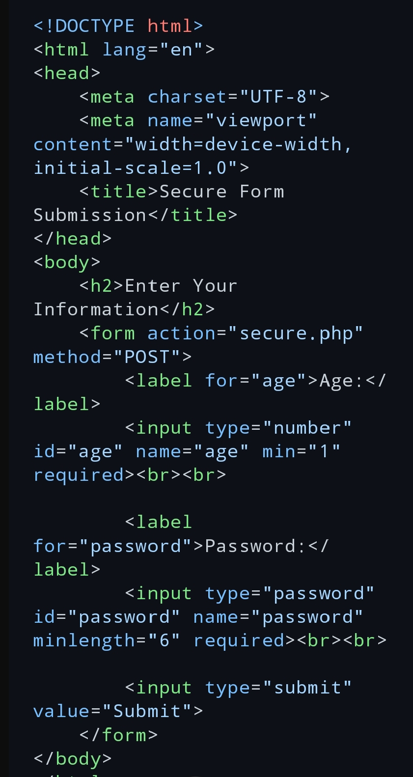 < Action="Secure.php" Method="POST">, < For="Age">Age: < Type="Number" id="Age" name="Age" min="1" Required> < ,For="Password">Password,:</>