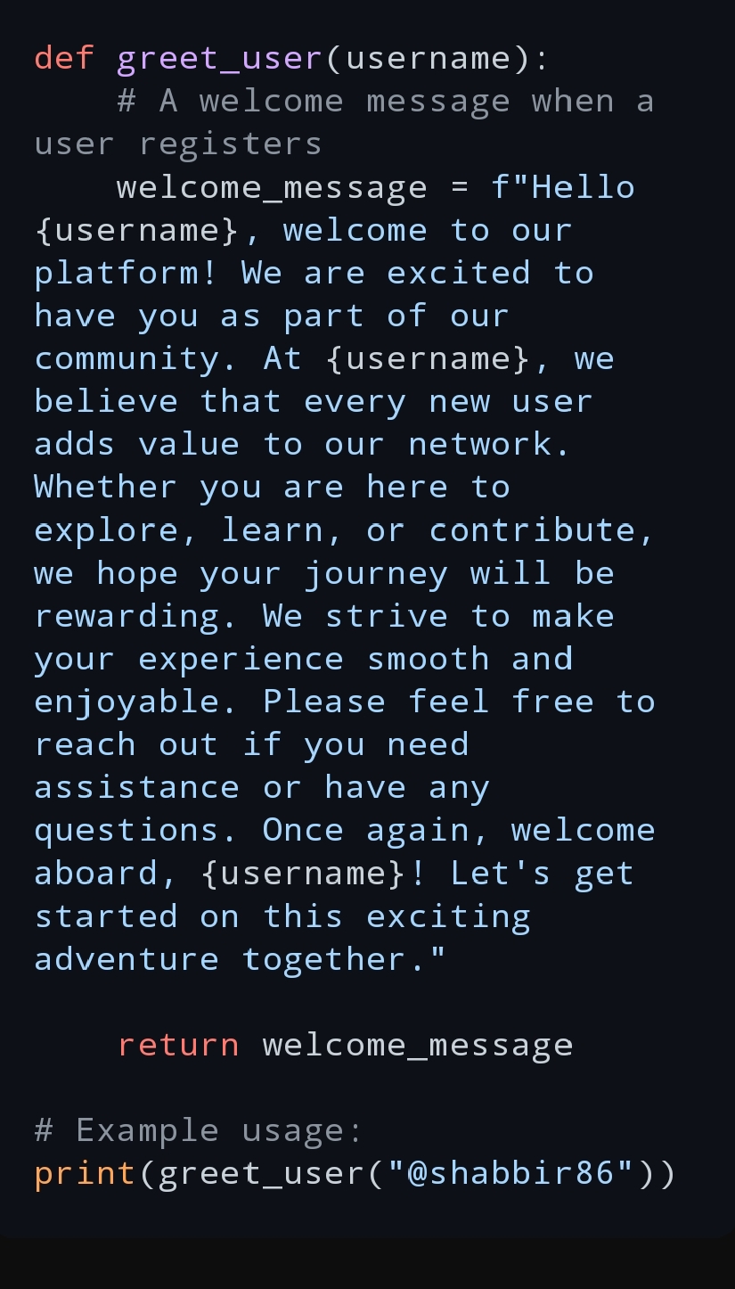 Welcome_message = f"Hello {username}, Welcome To our Platform! We Are excited to have you as part of our community. At {username}, we Believe that Every new user adds Value to our network. Whether you are here to explore, learn, or Contribute we hope your journey will be rewarding. We strive to make your Experience smooth and enjoyable. Please Feel free to Reach out if you need assistance or have any questions. Once again, welcome aboard, {username}! Let's get started on this exciting adventure together."