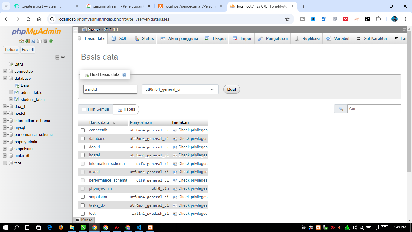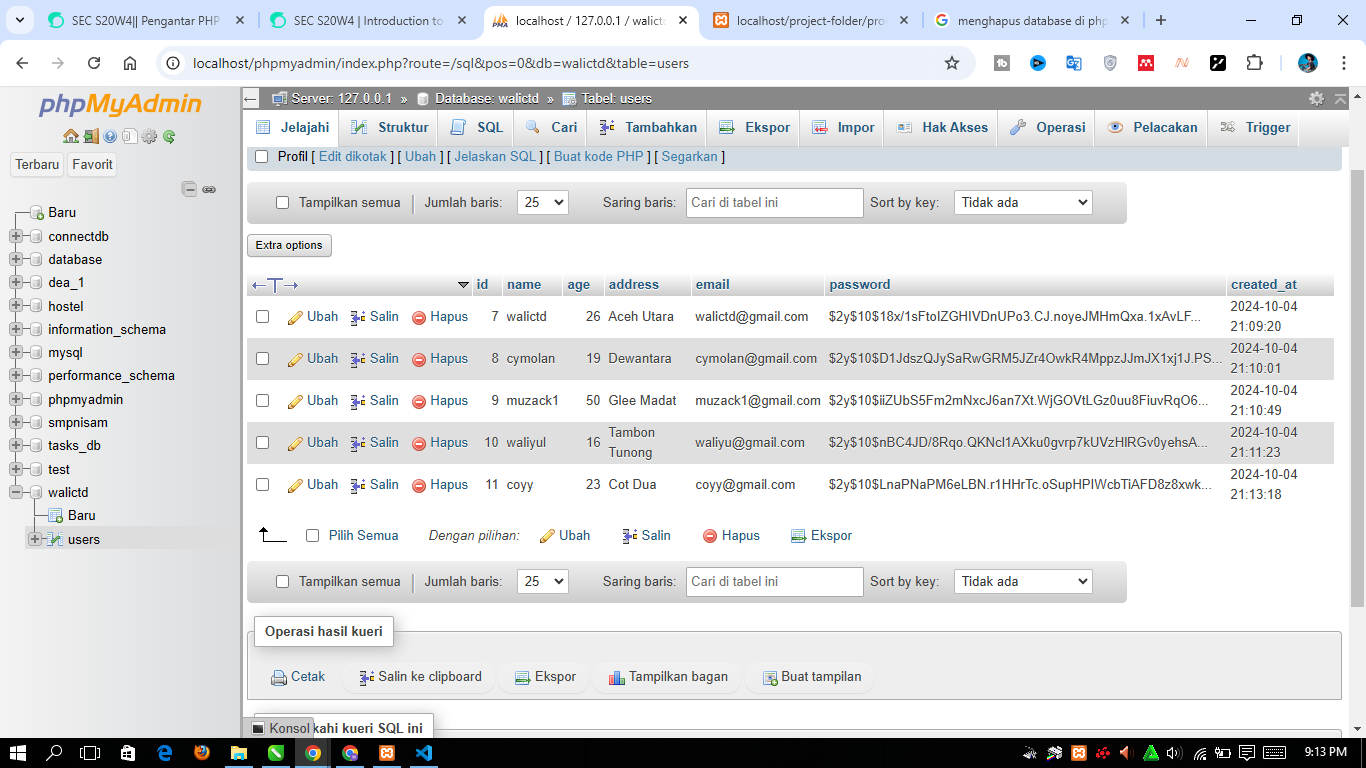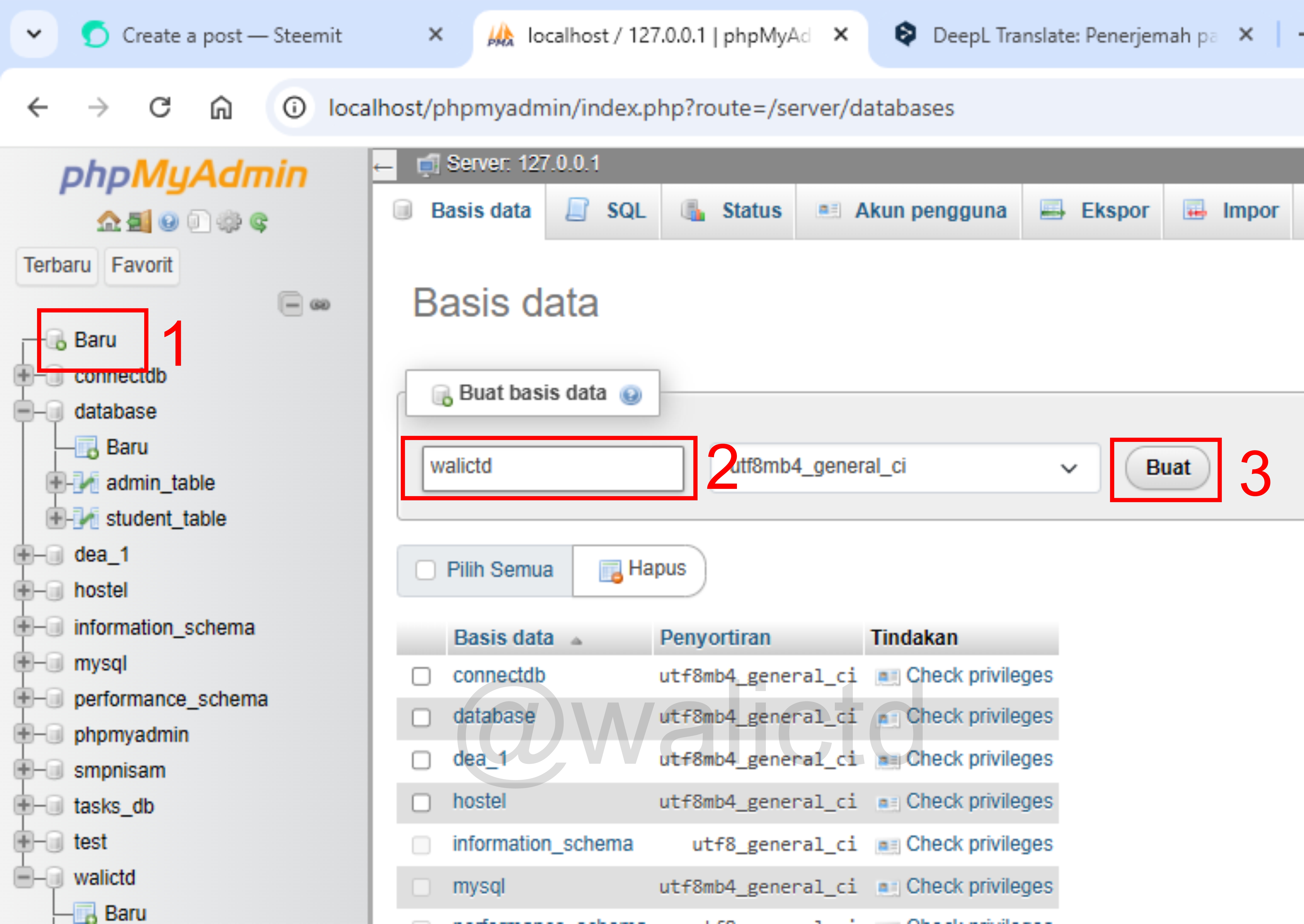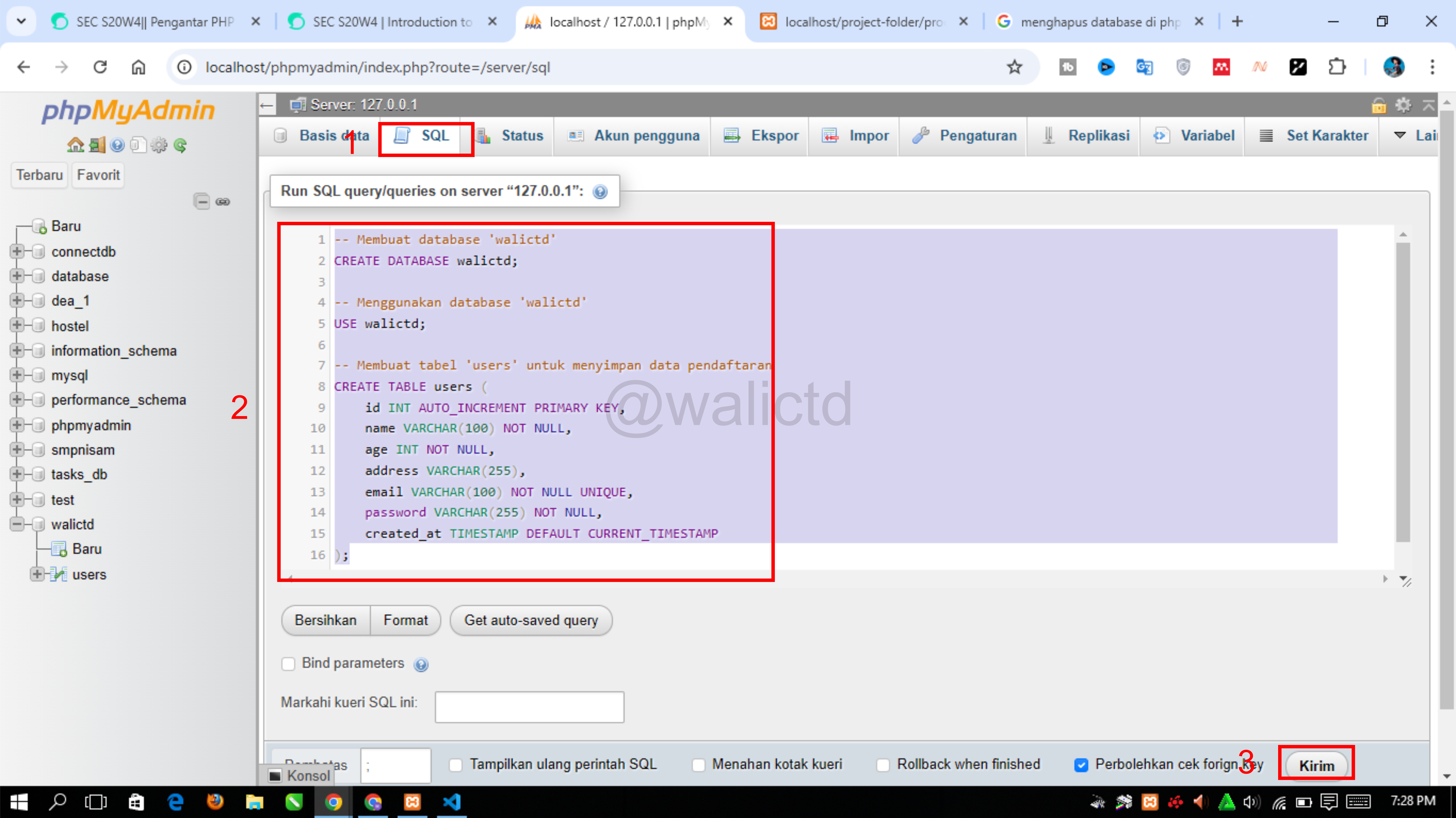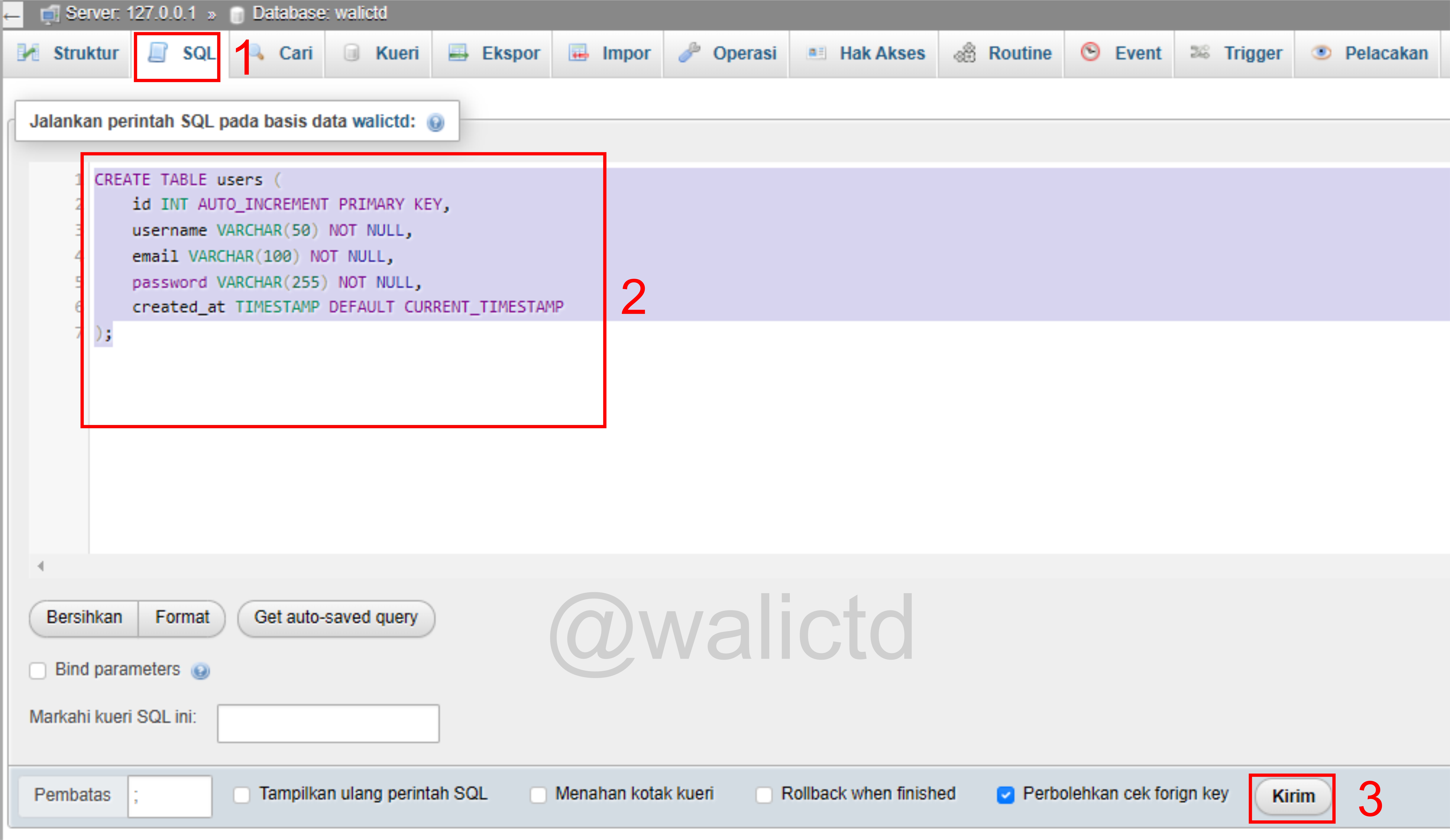 Select 1 to create a new database, fill in the database name in column number 2 and save it in number 3. In the picture above I gave the database name is walictd. Next, I will create 4 tables for the registration page, then I will press the SQL menu on the walictd database: