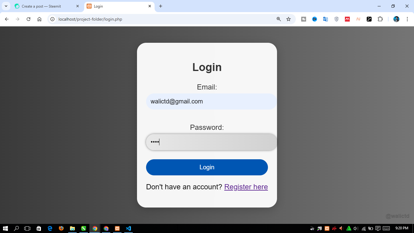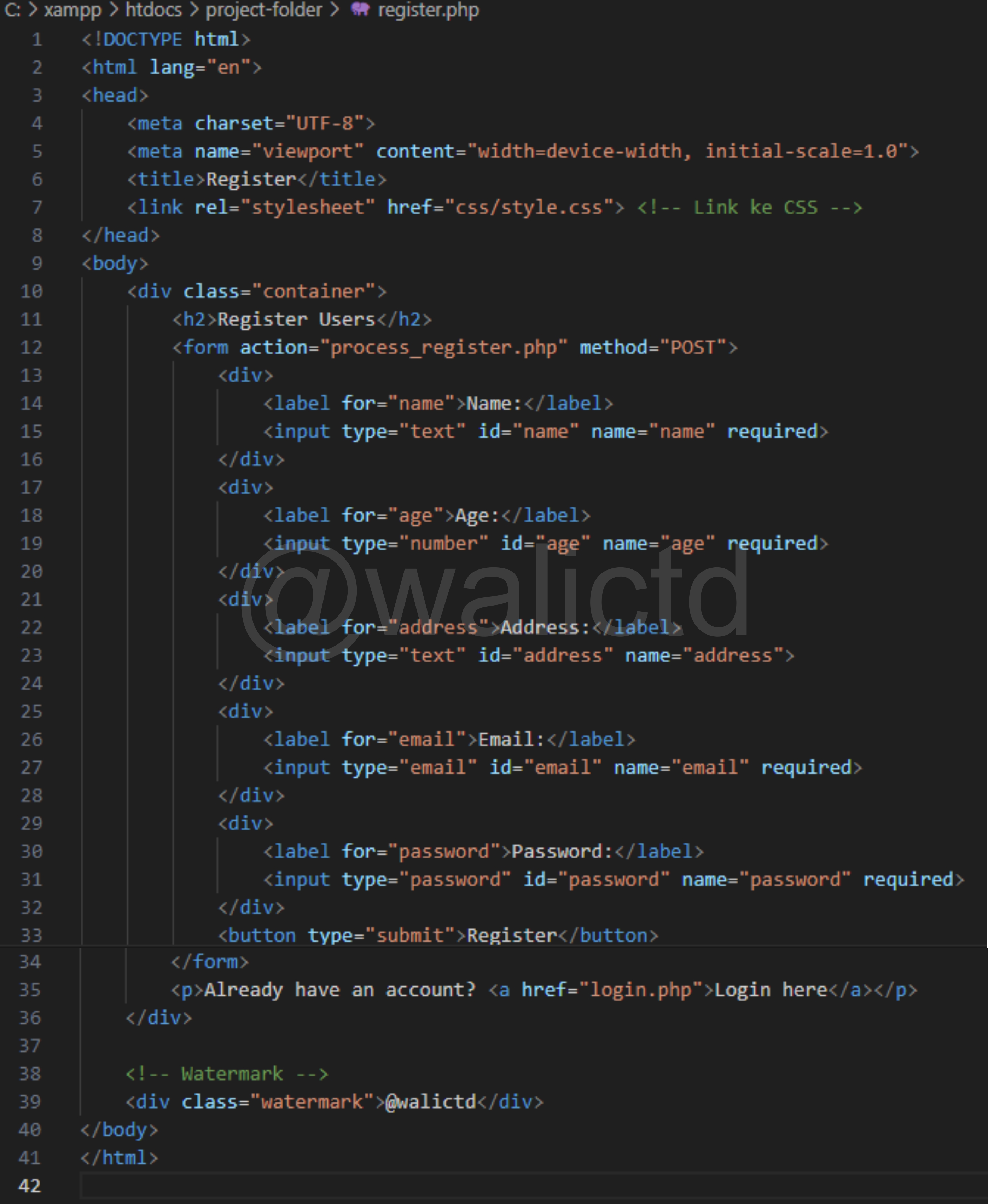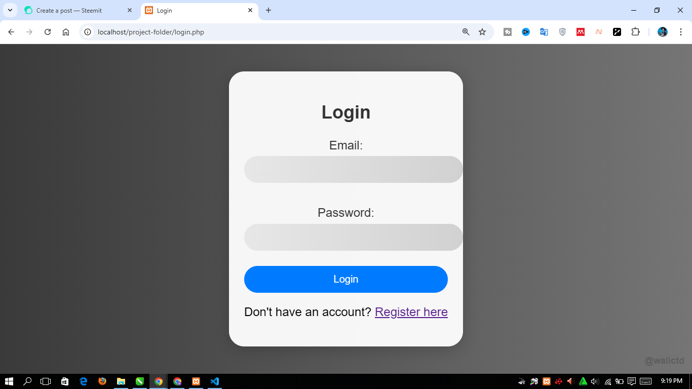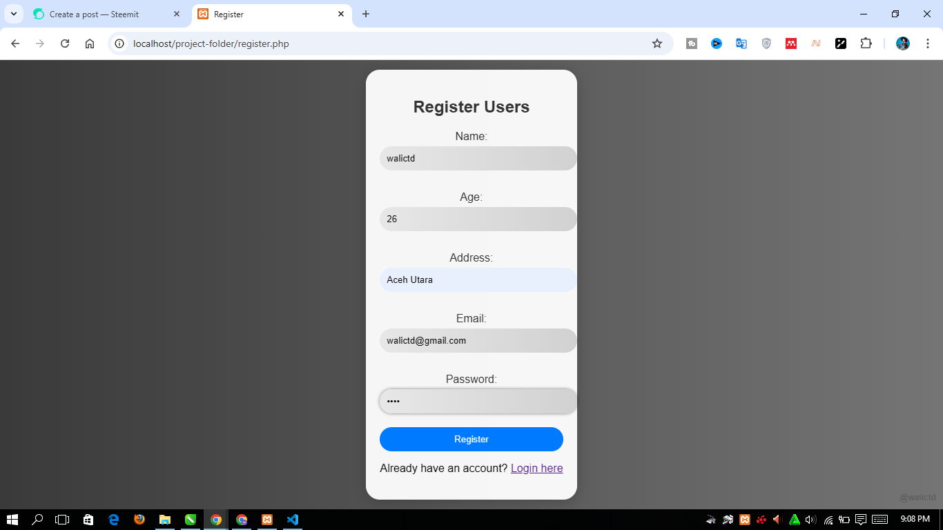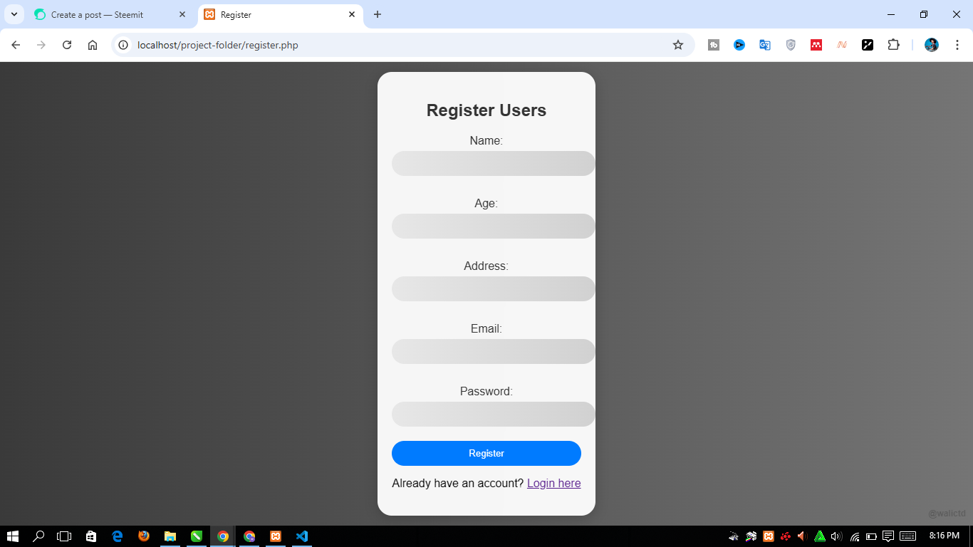 Next we will see the main view of the register.php file by typing “http://localhost/project-folder/register.php” in Chrome. Here's what it looks like: