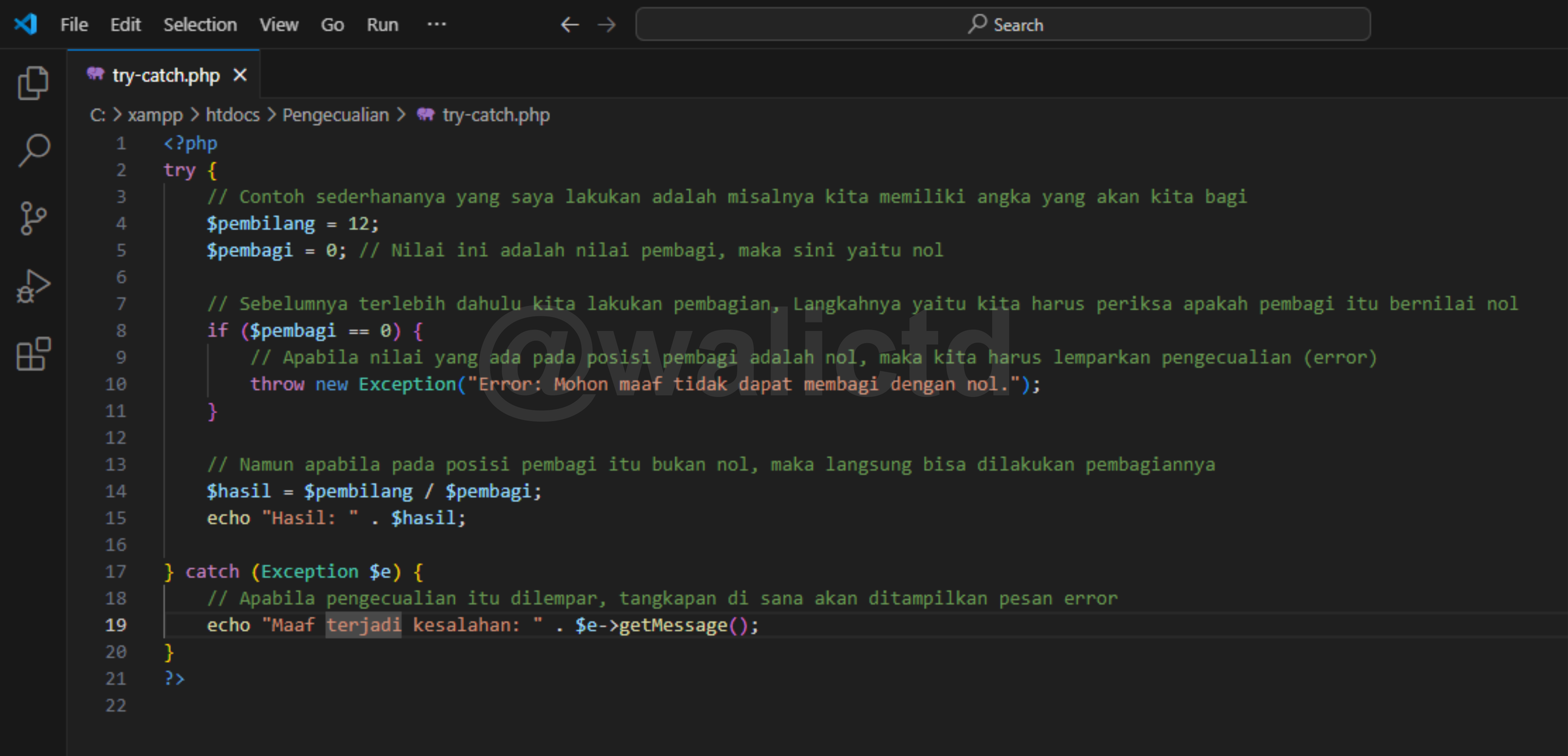 - The try block: In this code I write to make sure what might cause an error. In the example above, I tried to divide the number 12 by the divisor value that I set to 0. As we want to prove that division by zero is not allowed, I will see if the divisor value before performing the operation.
