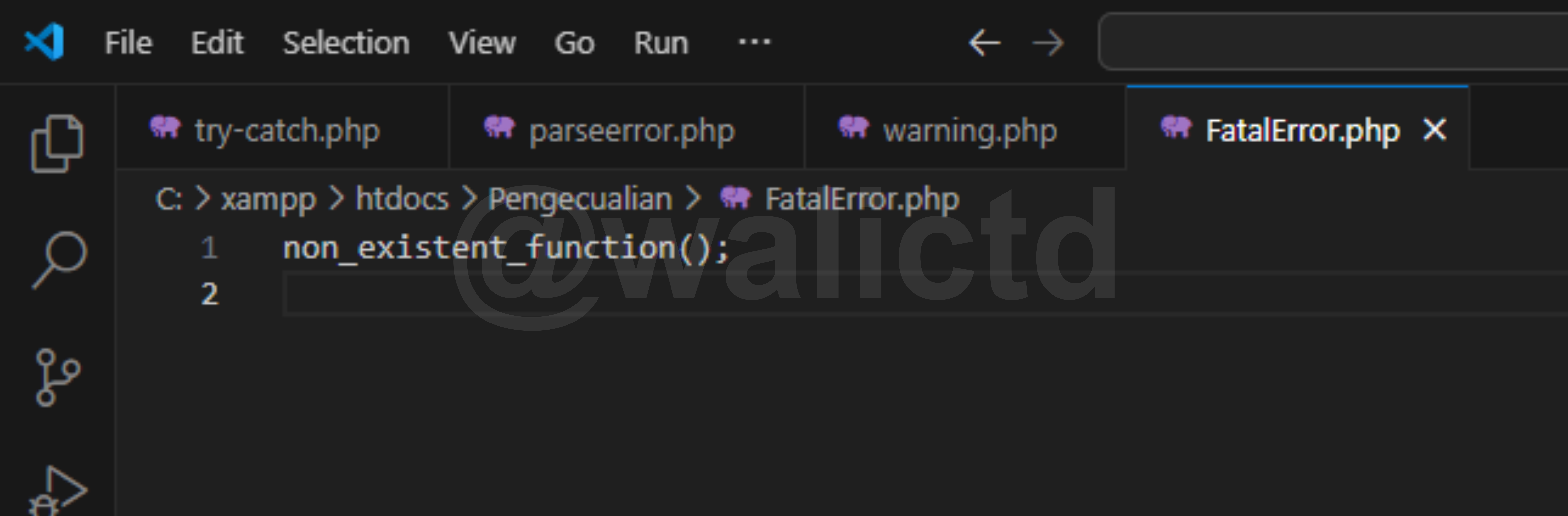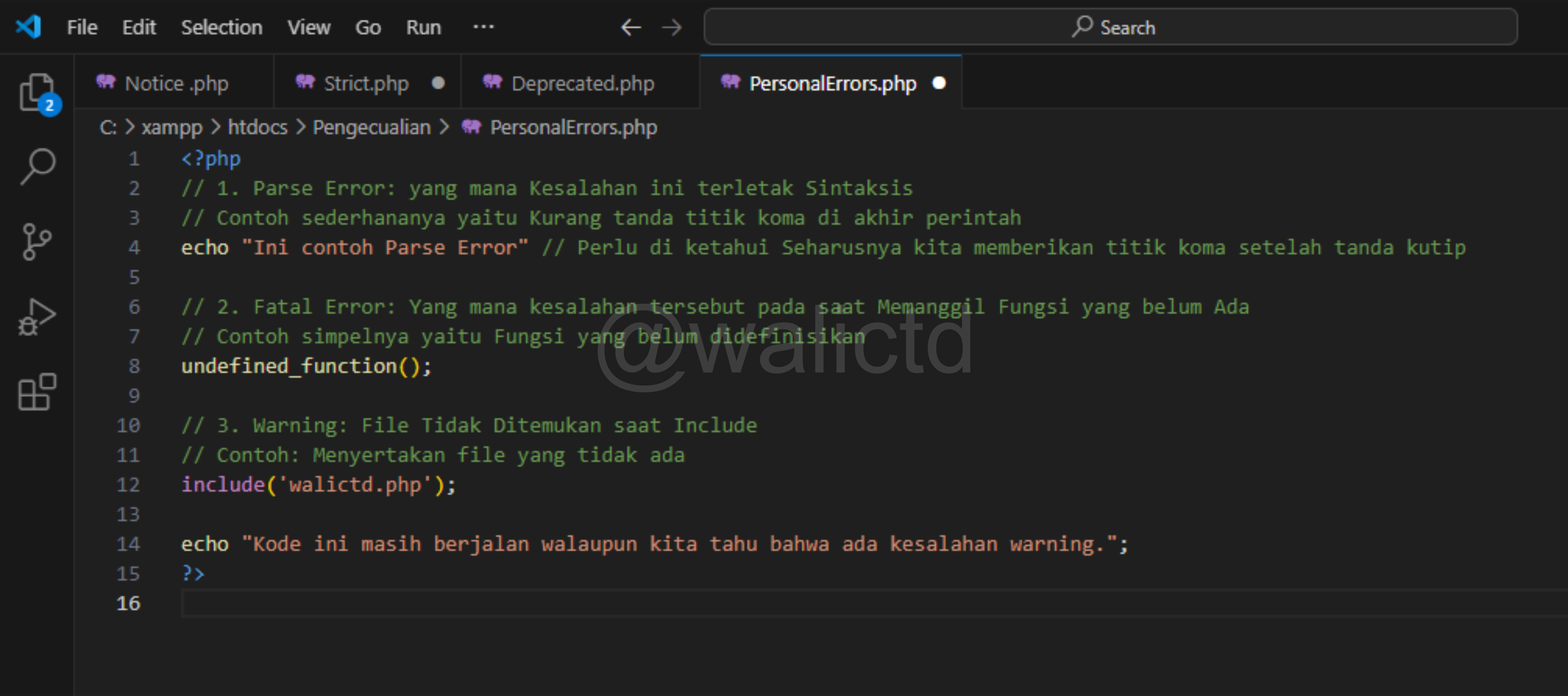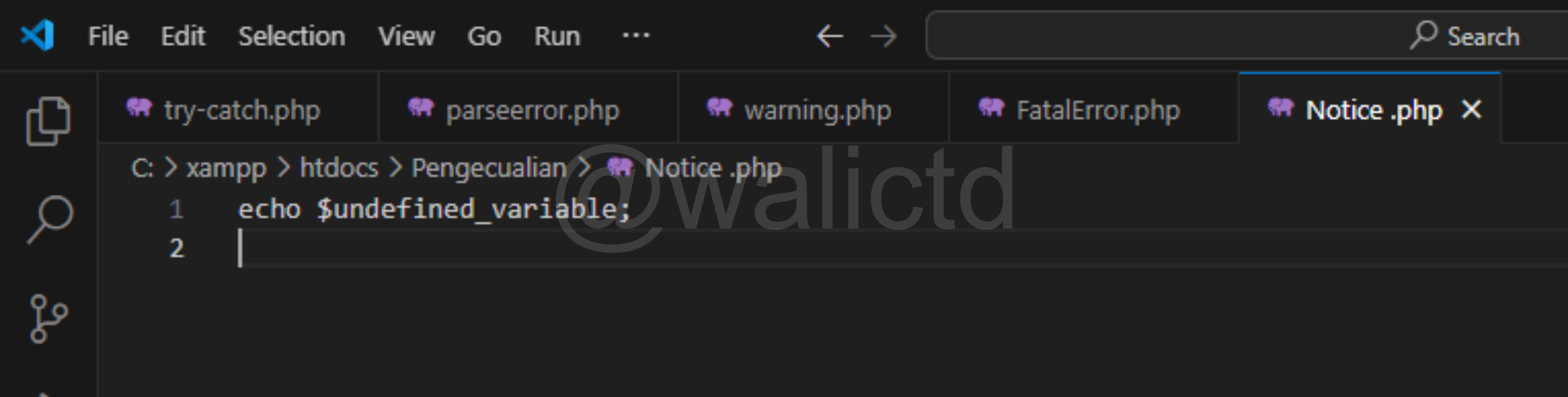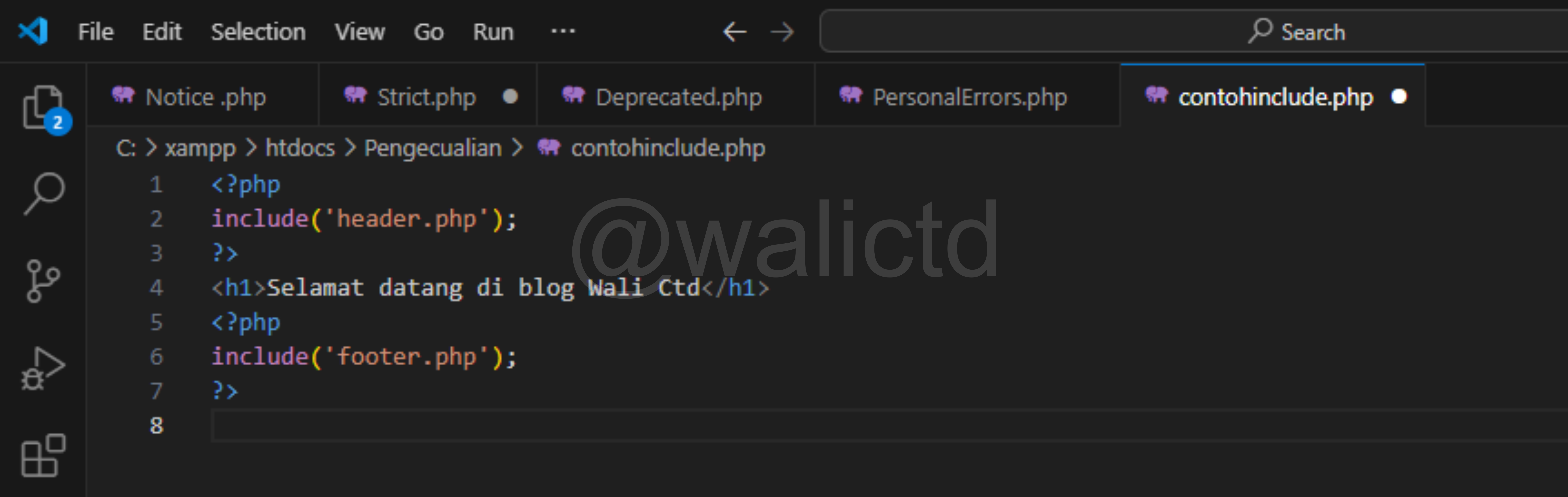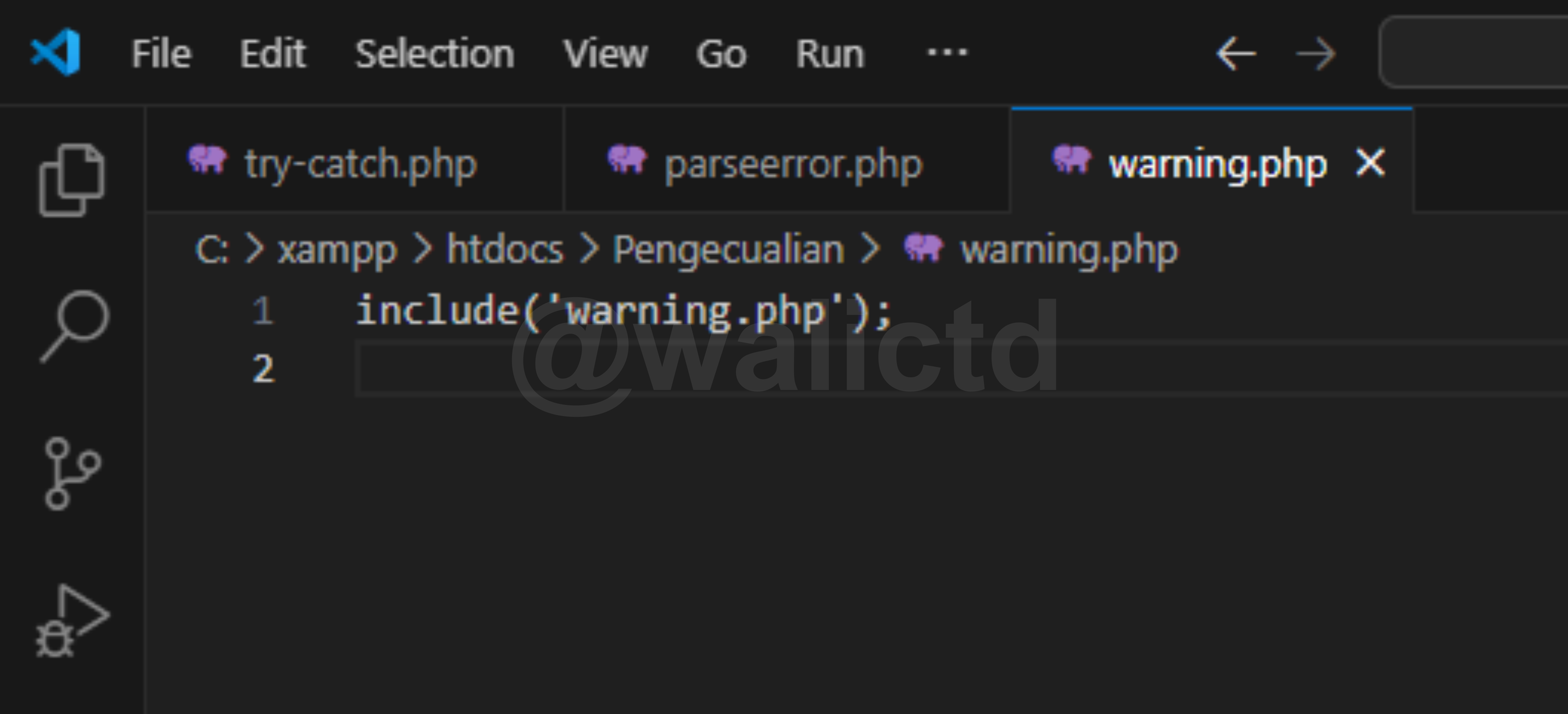 The last one is the Warning error, now we can see on the third line, that PHP wants to include the walictd.php file, which clearly does not exist or we have not created it. So it will produce the Warning error, but the next code (echo command) can still run.