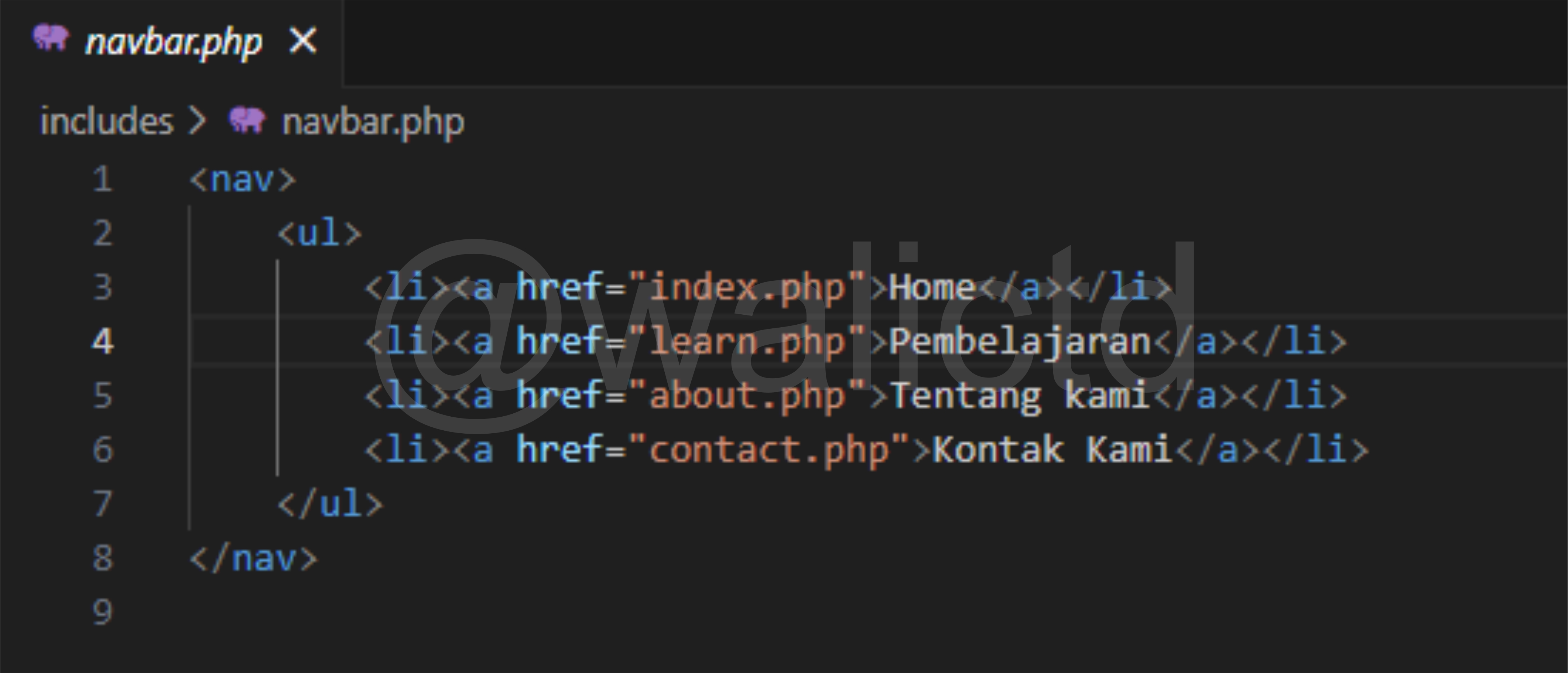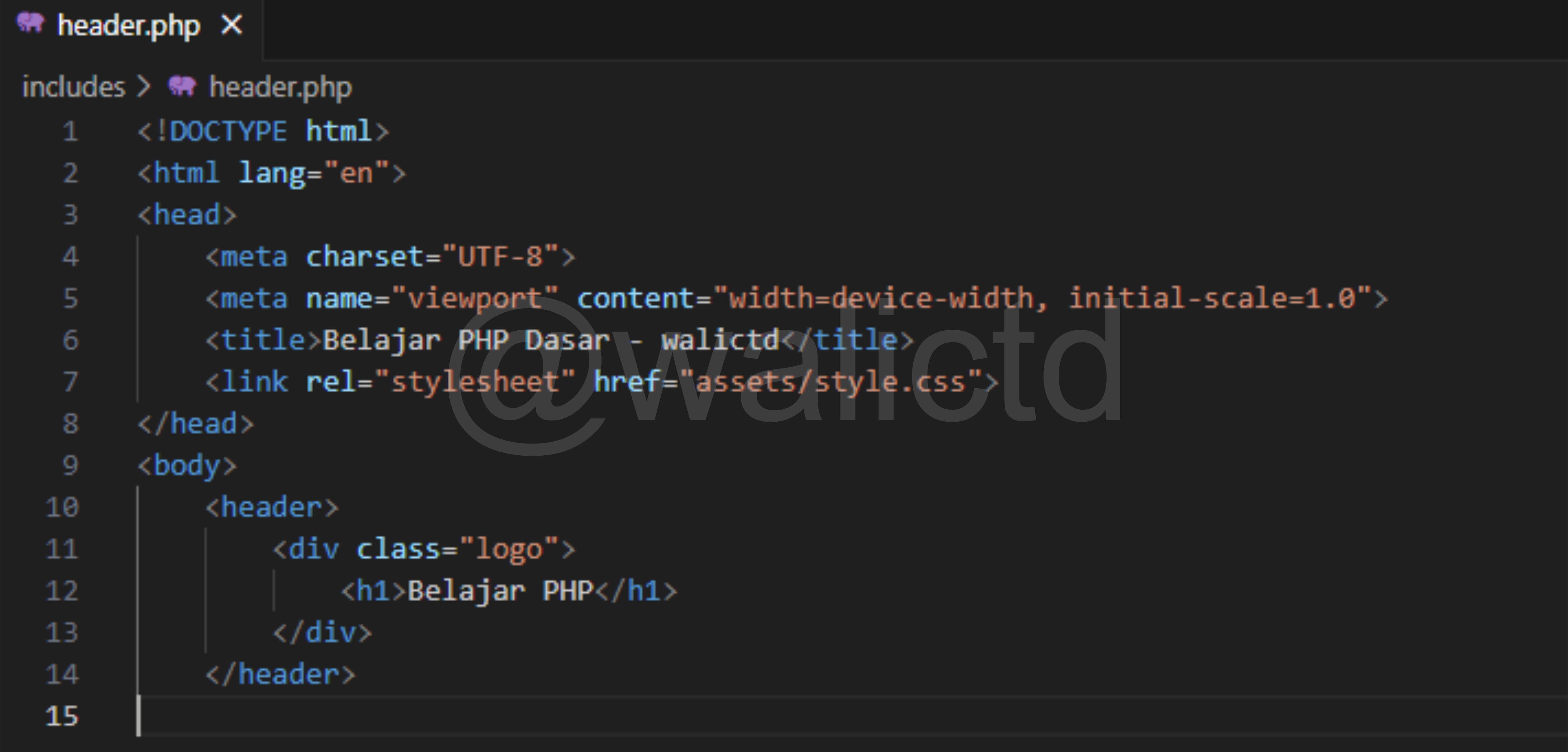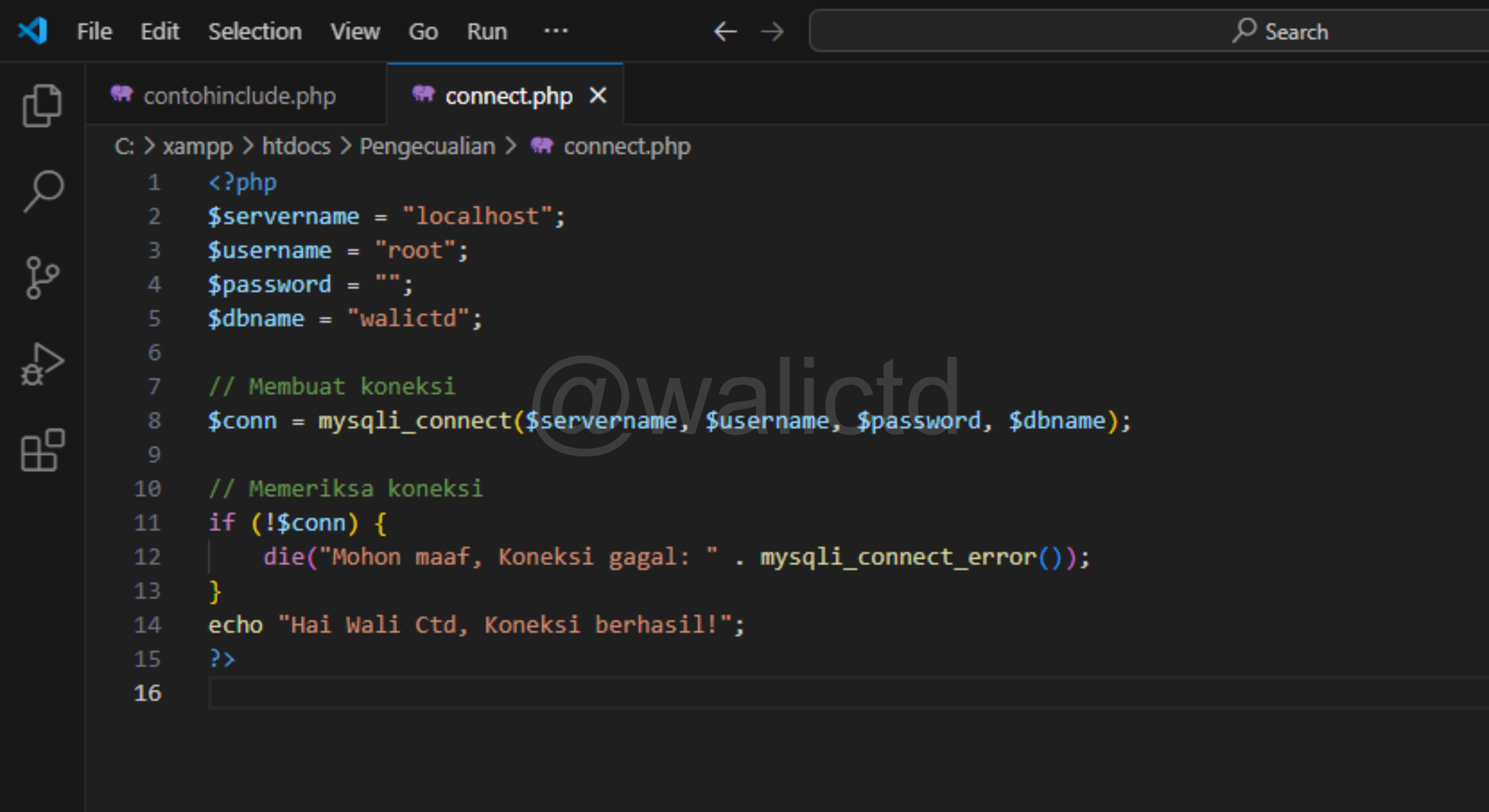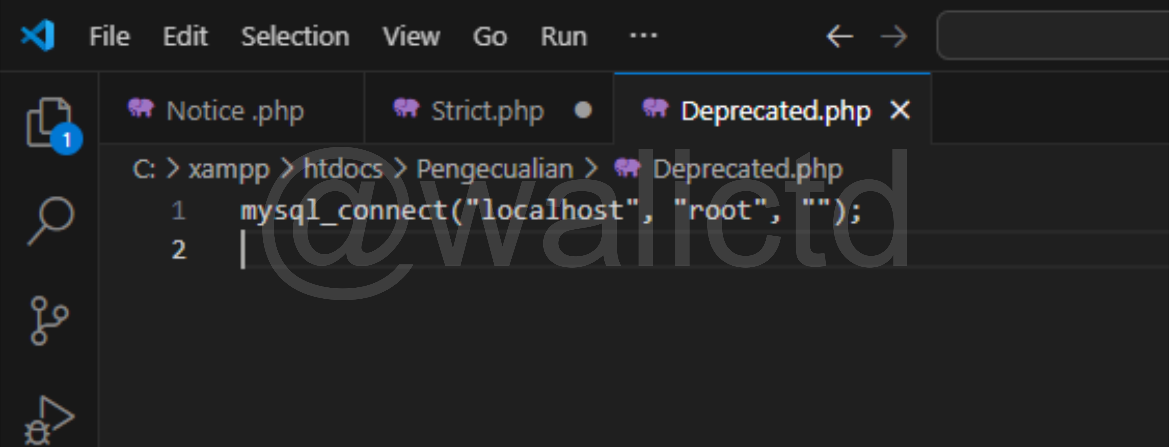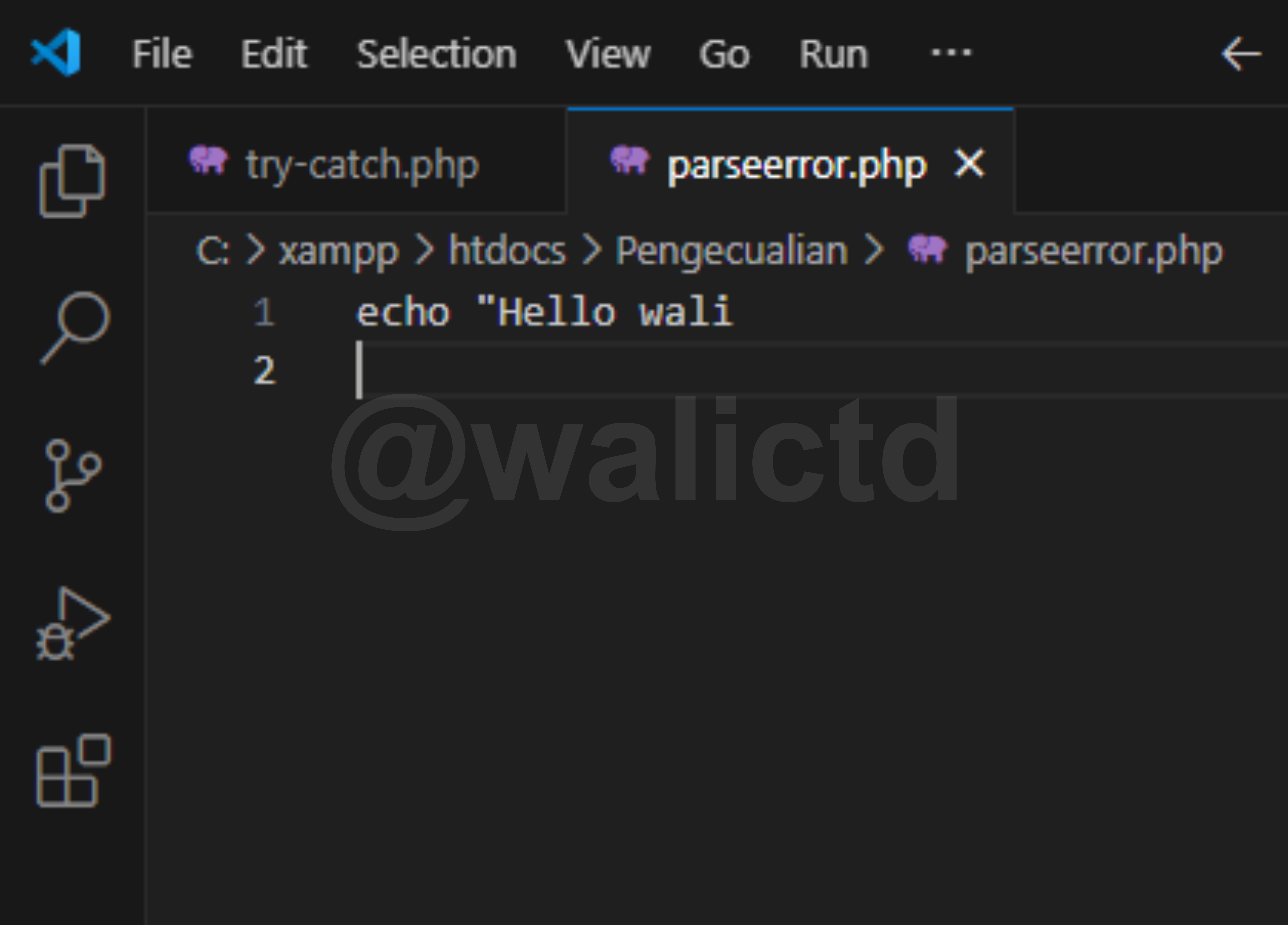 The last one is the Warning error, now we can see on the third line, that PHP wants to include the walictd.php file, which clearly does not exist or we have not created it. So it will produce the Warning error, but the next code (echo command) can still run.
