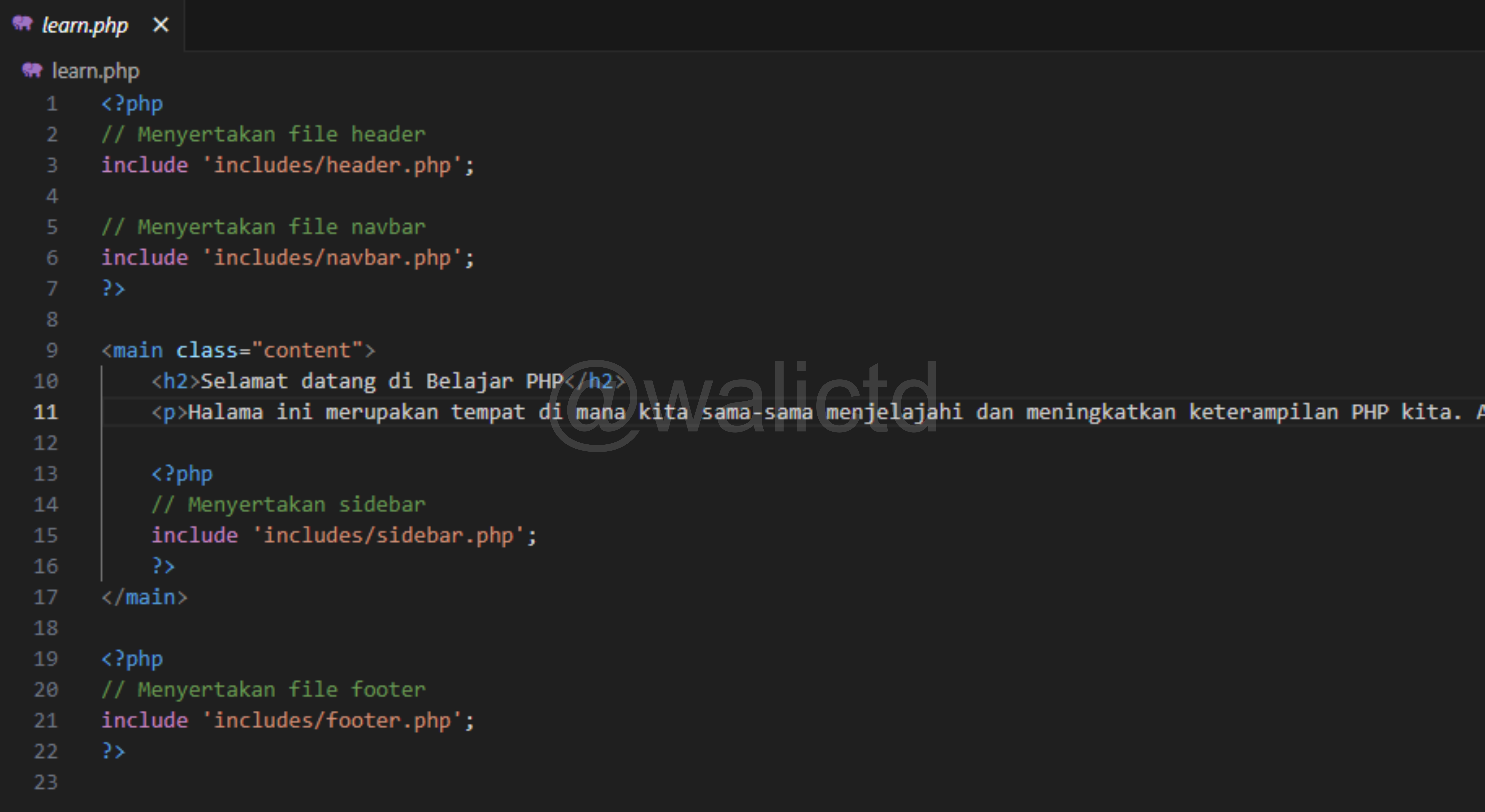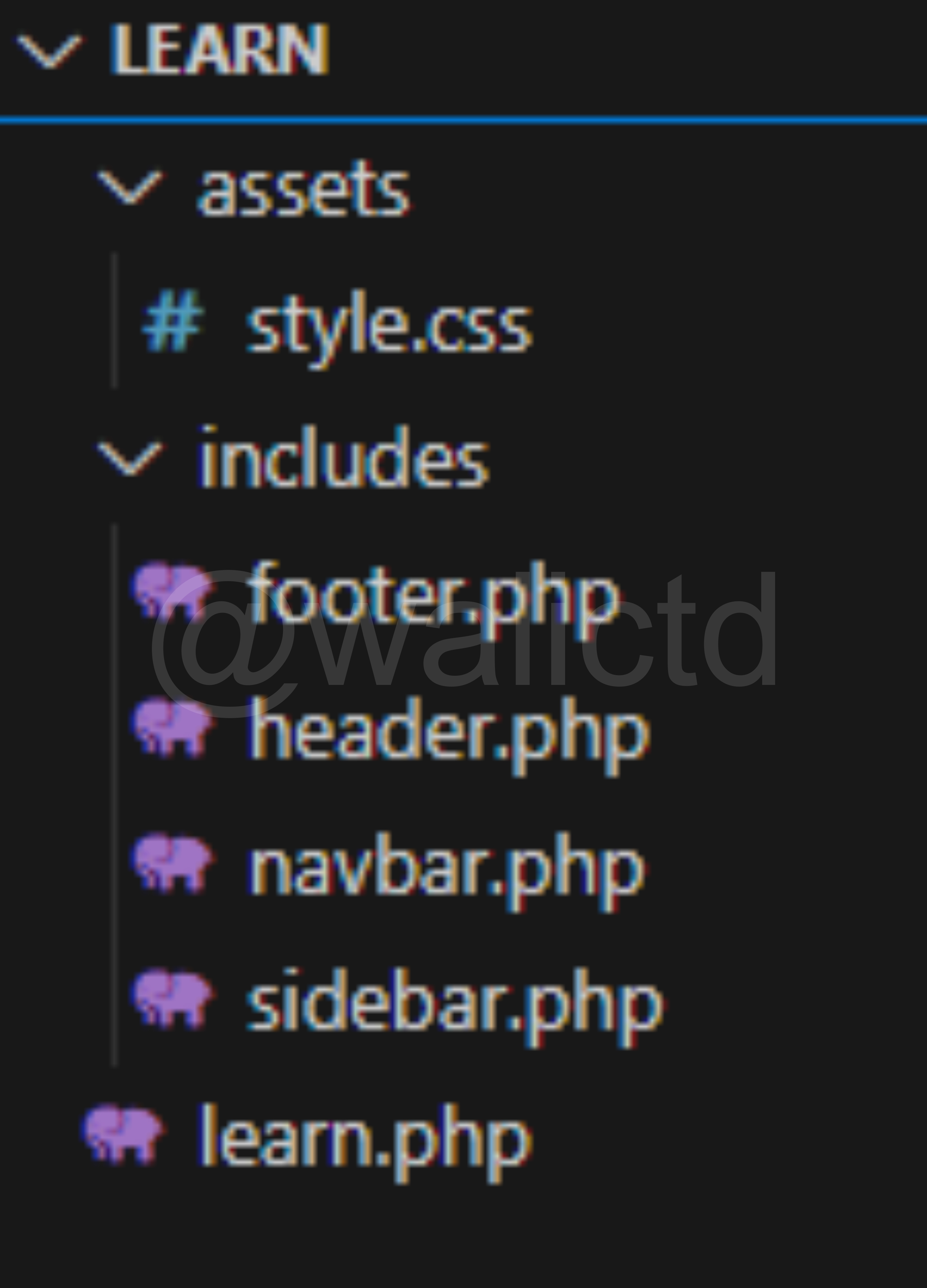 Before entering the coding, I first created a folder called “learn” and stored it in (C:\xampp\htdocs\learn). Inside the folder I will fill it with the learn.php file, and create a new folder as well which I name “includes” and “assets”. In the “includes” folder I will fill it with files: header.php, navbar.php, sidebar.php, footer.php, while in the “assets” folder I will fill it with: style.css.