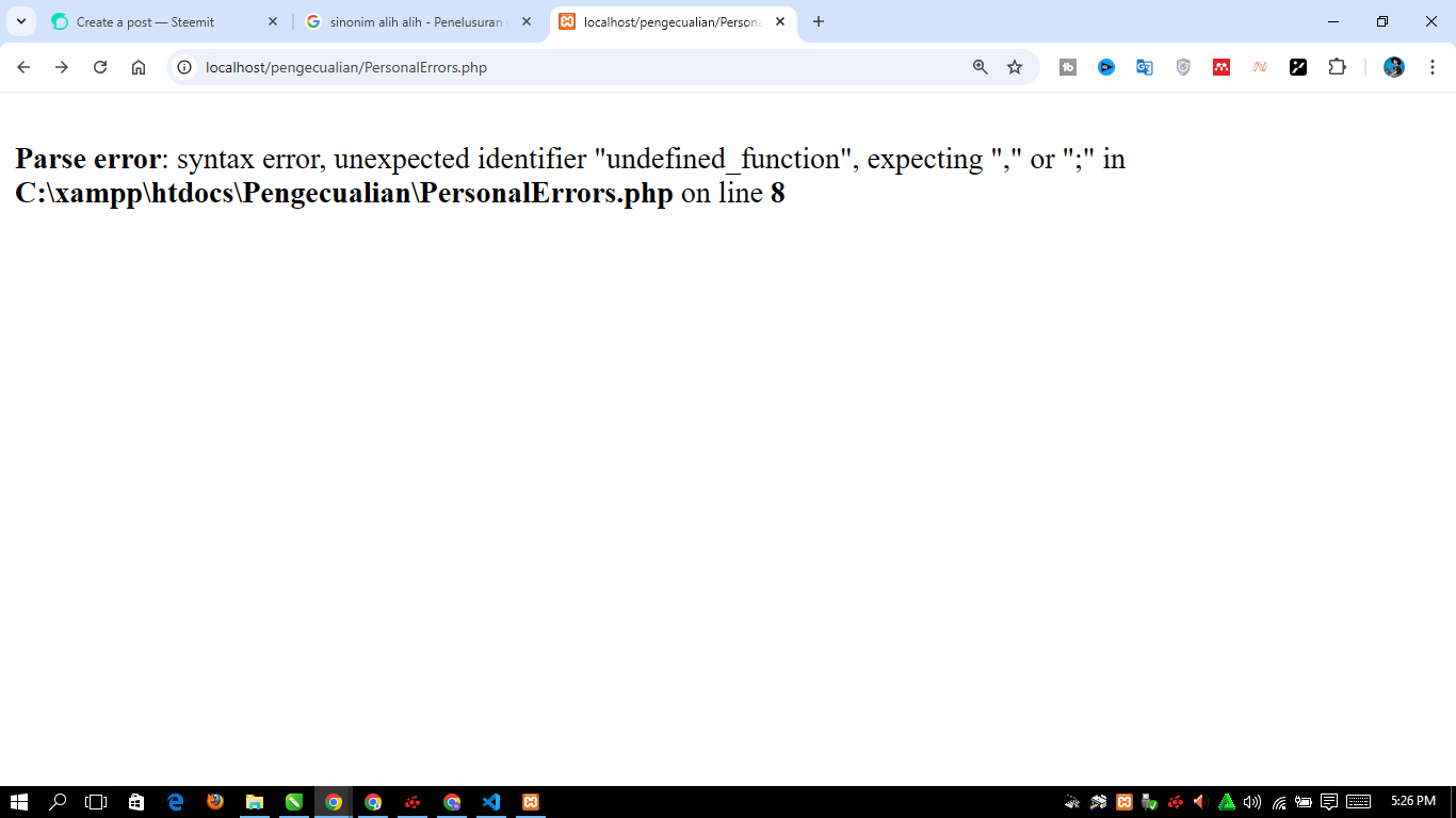The first is a Parse Error that we may have explained before, well In the first line, there is an echo command that is wrong because there is no semicolon at the end (;). So that this kind of error will This will bring up Parse Error when we run the program, the way I overcome it is usually by paying close attention to the notification and then looking for solutions in the videos on youtube so that the solution can be found.