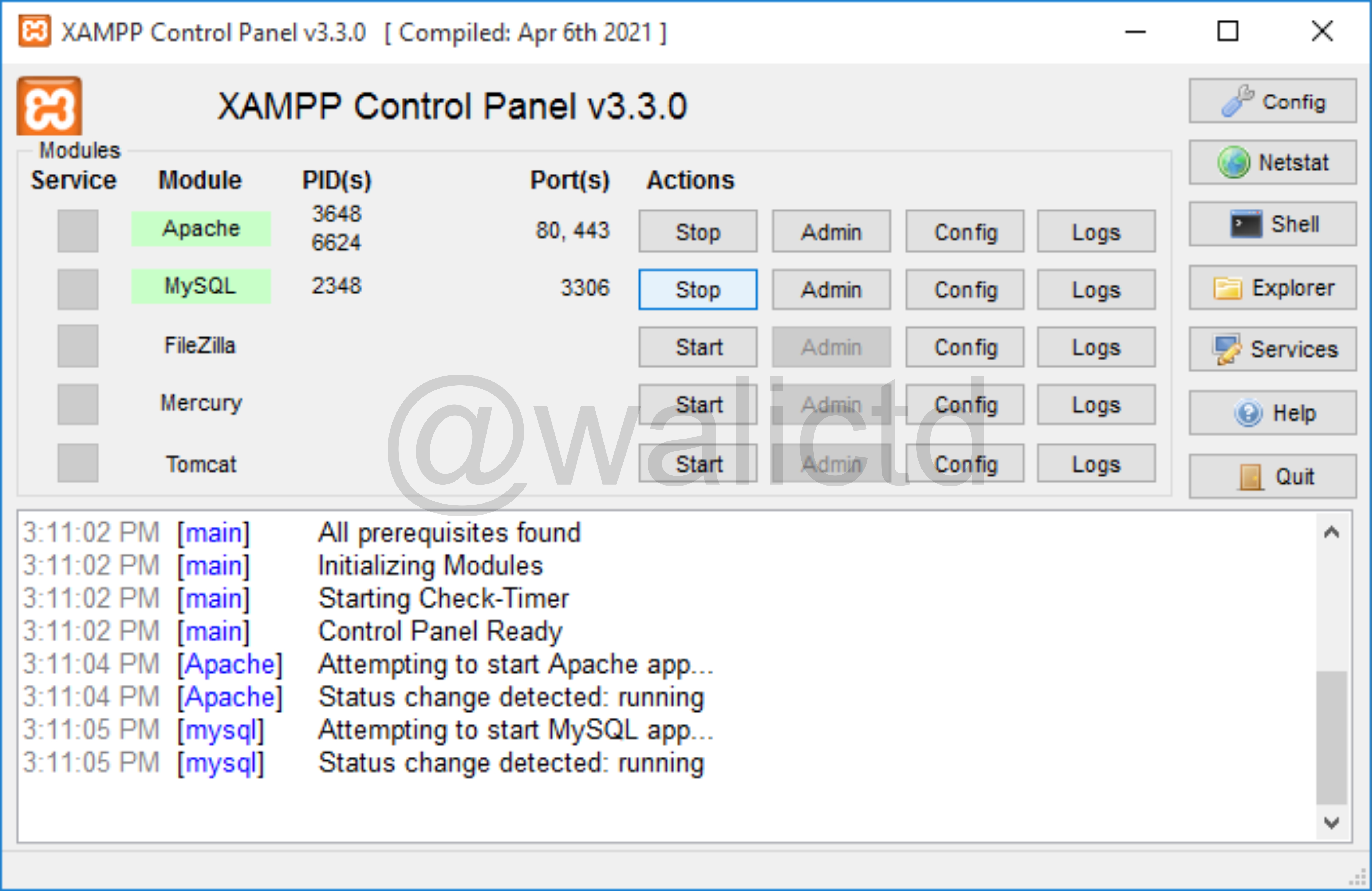 To create a database file, we must first make sure to start XAMPP, where we must activate Apache and Mysql.