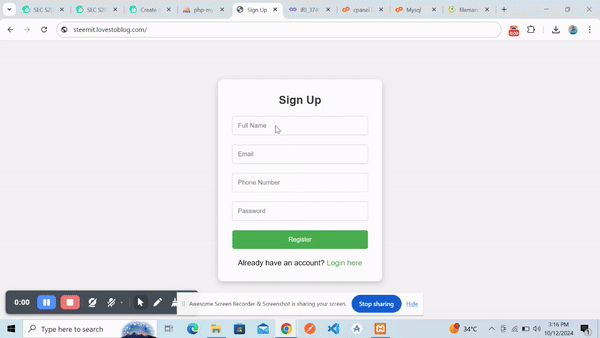 Here you can see that my website is completely live after a lot of work and efforts to connect the website and database. The registration and log in form are working smoothly. The registration form have different fields such as name, email, phone number and password. After the registration the database is collection all the data in the table.