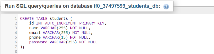 I wrote this query to create a database to store the registration details of the students. As in the previous lecture we built a student registration form. So here again I am using these forms and I need a similar database.