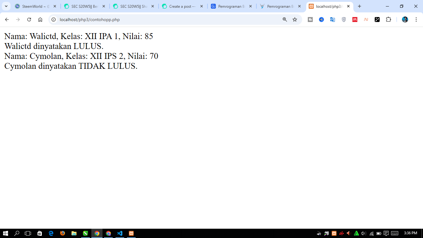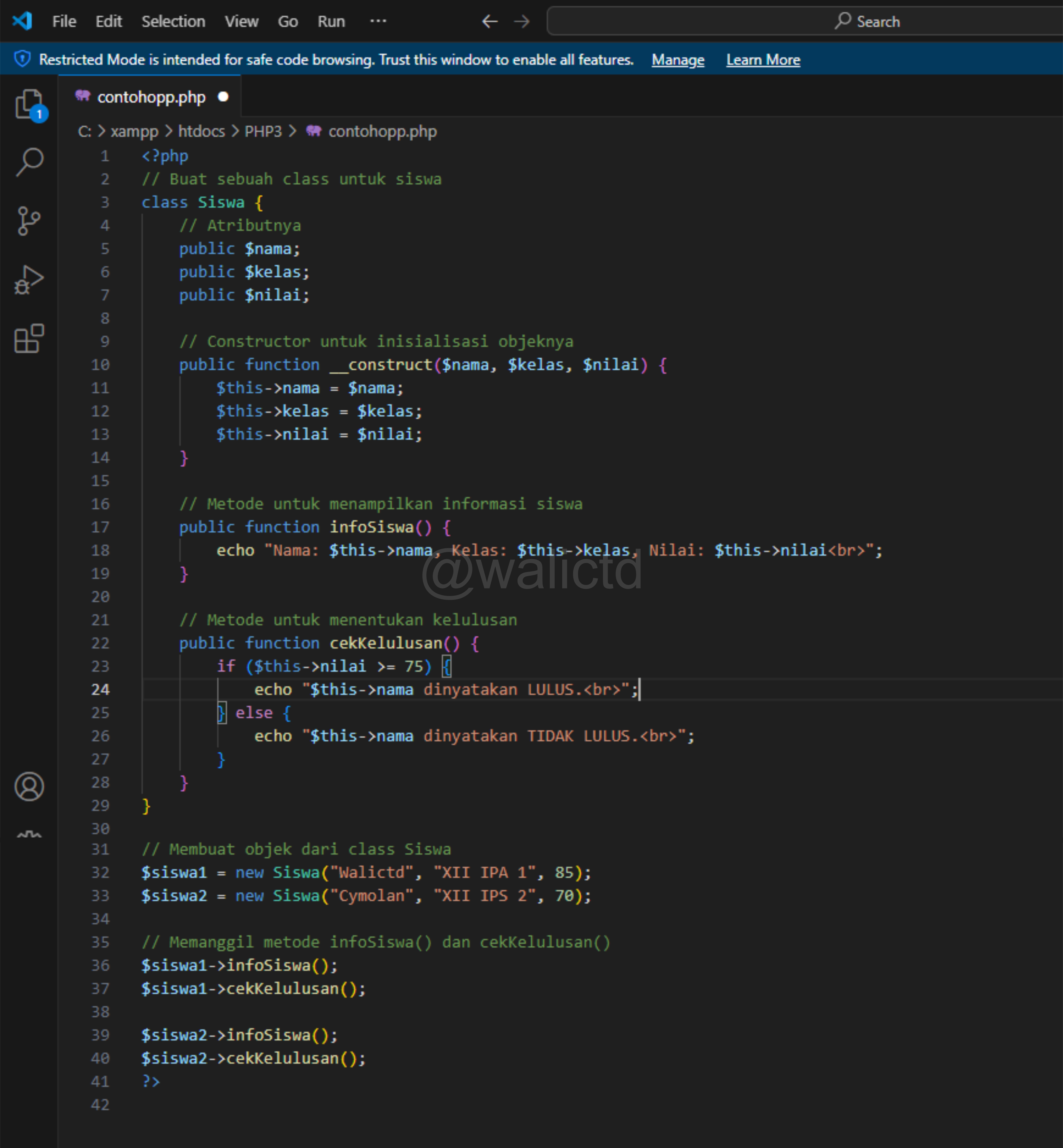 Next, I created 2 objects, namely student1 and student2, at new Siswa("Walictd", "XII IPA 1", 85) there we create a student object named Walictd in class XII IPA 1 who has a score of for example 85. At siswa1->infoSiswa() it intends to call the method in order to display the Walictd information. siswa1->cekKelulusan() check whether Walictd passed or failed.