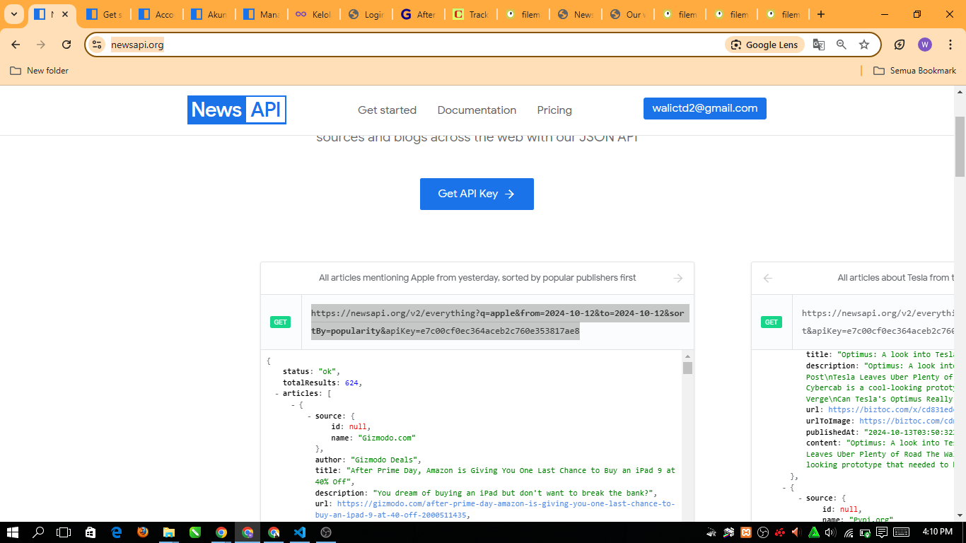To get the API, I visited the web: https://newsapi.org/. After registering the account then we will copy the API code then we enter it into our code.