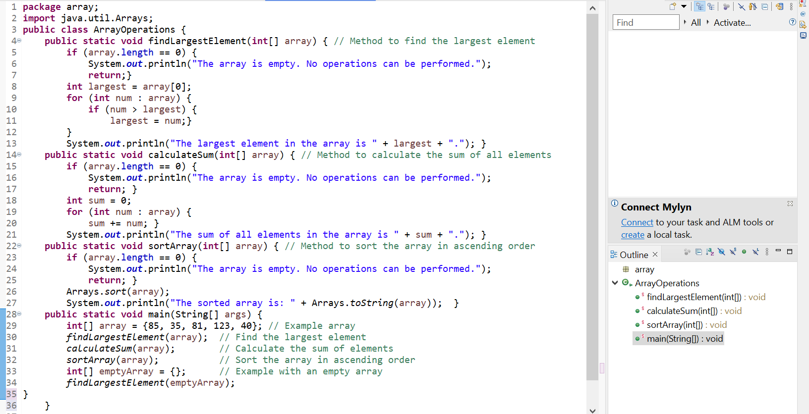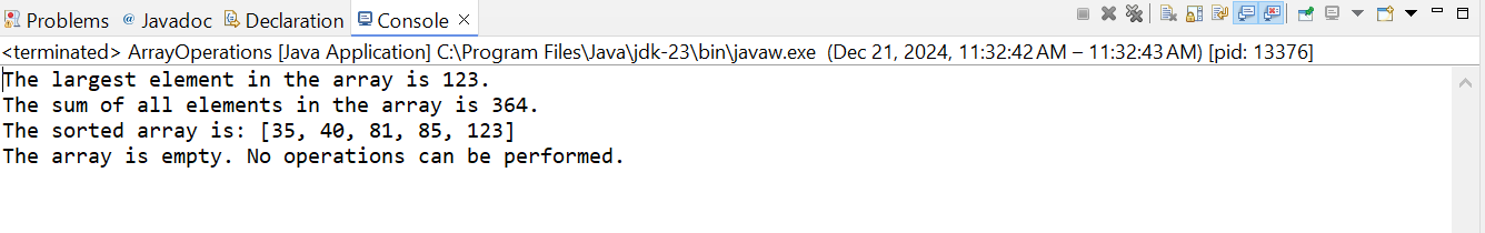 ArrayOperations. In the class there are four functions to find out the largest element, sum and sorted array and the main function to handle the program.The first function is checking all the numbers in the array and it is returning the largest number.