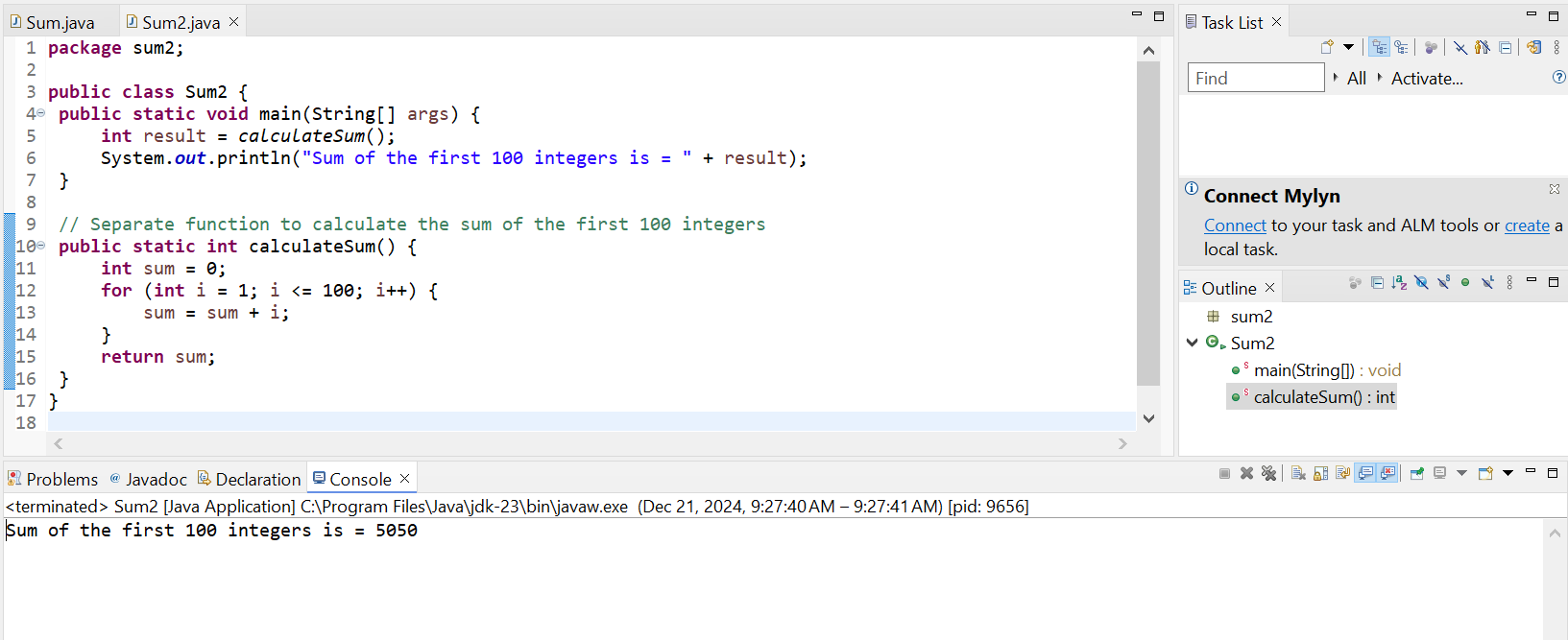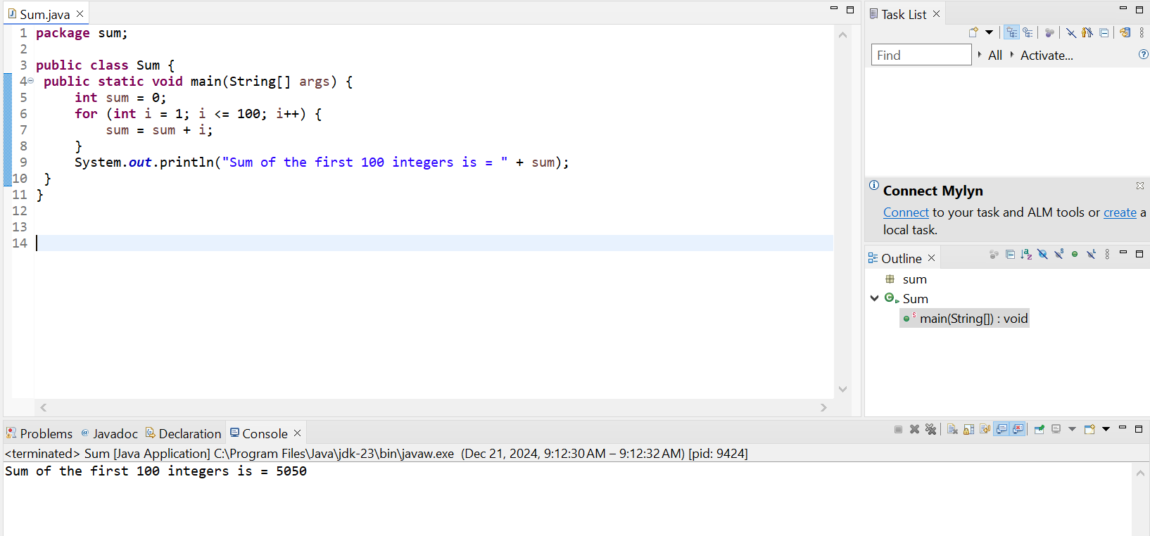 This is the simple addition program to add the first 100 integers. The entire calculation is handled in the main method.