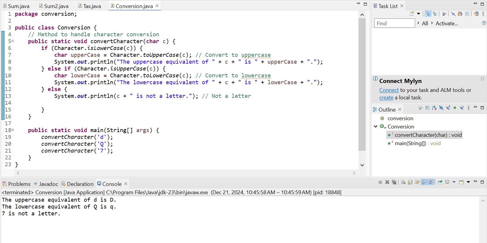 Conversionand there is aconvert Characterfunction in which there are the rules to convert the uppercase letter to the lowercase and similarly for the lowercase to uppercase.Character.isLowerCase(c)checks if a given character is a lowercase or not.Character.isUpperCase(c)checks if a given character is a uppercase or not.If the given chracter is neither an uppercase nor a lowercase then it returns not a letter.