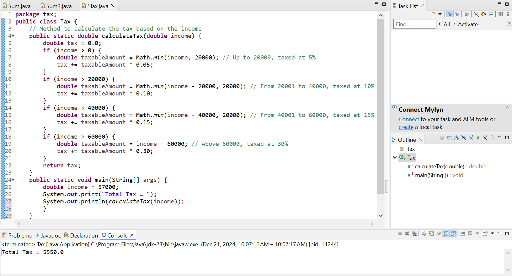 income = 57000;to calculate tax for this amount of income.After giving this amount of income the program has calculated the correct amount of tax as expected which is 5550.