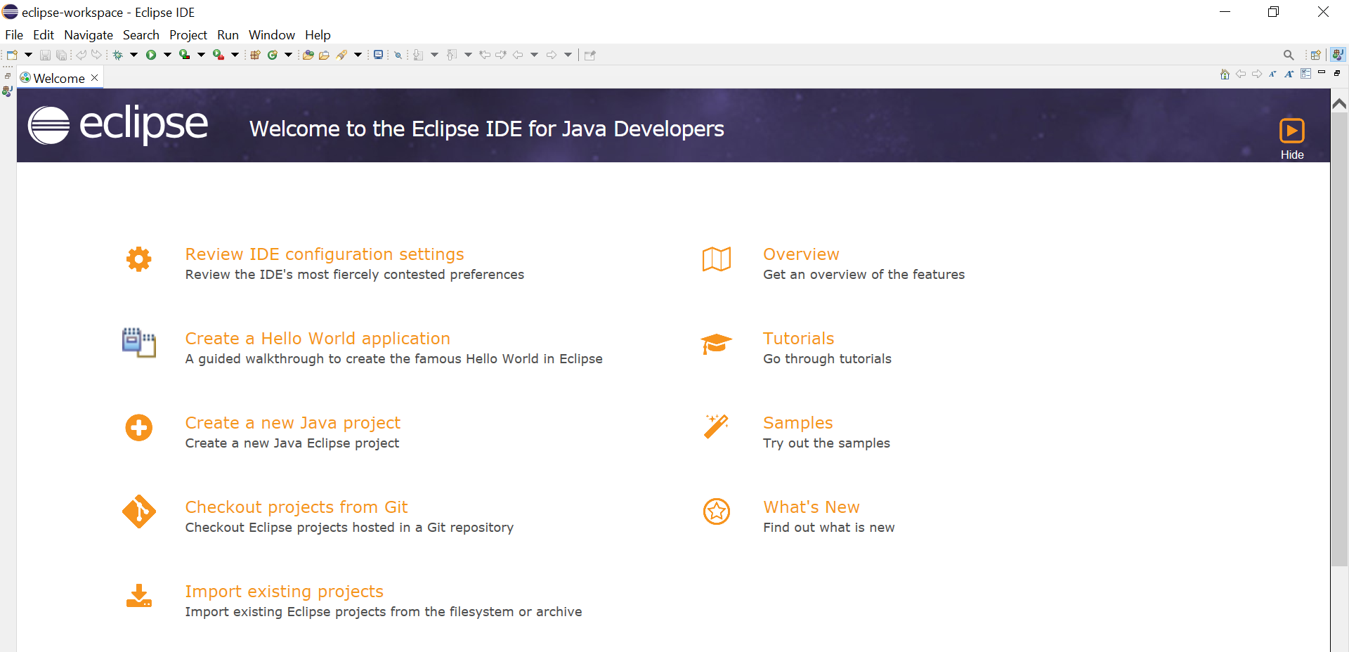 - This is the first look of Eclipse IDE.