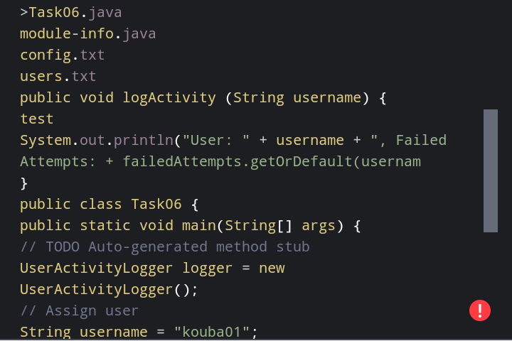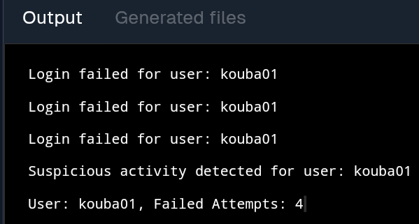 Creating program to count log incorrect login attempt throwing SuspiciousActivityException to handle suspicious login attempts. This happens when case exceeds 3. We store numbers of failed attempt too. We decisively insert incorrect password. If statement check failed count and prints message. Login failed for user if a password is correct, failed attend count to reset to 0 the username and failed attempts would be visibly seen.