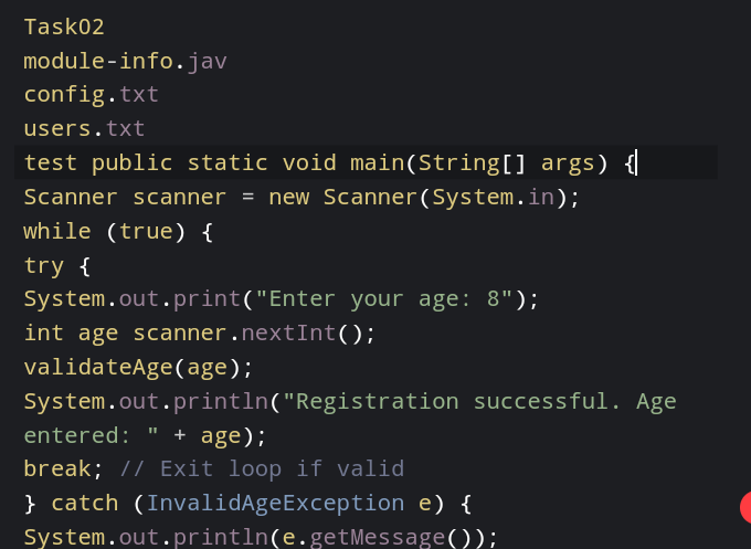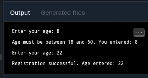 Program main goal is validate participant ages, log error for ages out of ranges. We create a method using InvalidAgeException which allows show clear message when input is valid using loops we repeat process to get user's age in the validAge method to source fo invalidAgeException The program checks age of less than 18 or greater than 60 as demanded and thus create this program