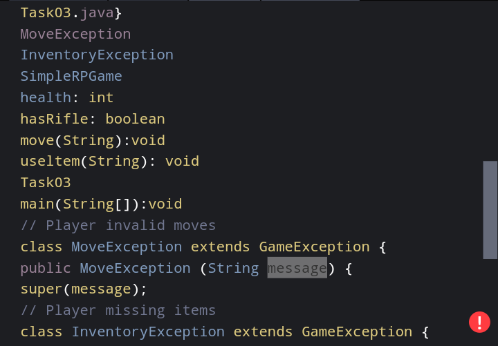 Handling mistakes use different creating logic to handle different errors, for special problems. Using Health Exception when health is low More Exception to spot wrong moves. InventoryExceptionwhen items are missing. These exception would definitely be for all existing exception.