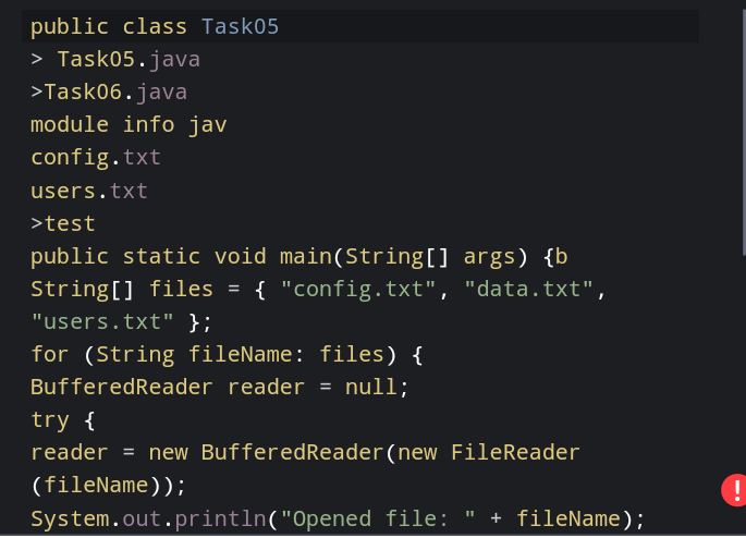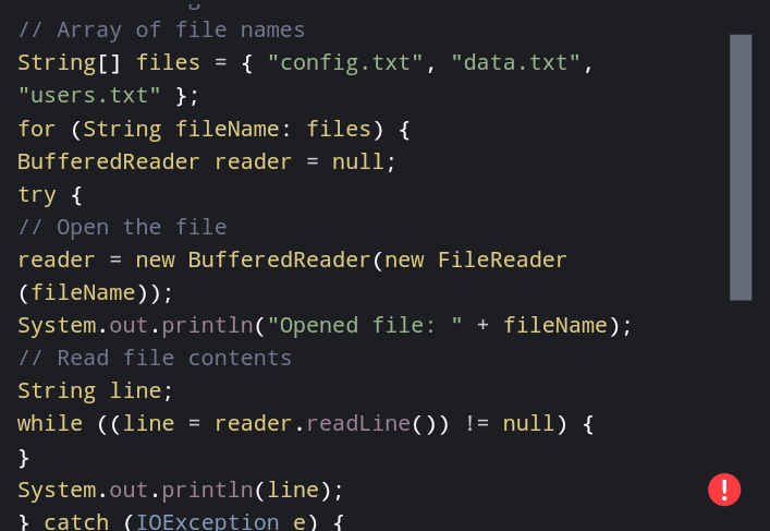 We create program that opens multiple files, read content and close them. We use try block whole ensuring the final block for cleanup is achieved, we use try to handle file related exceptions. We loop to iterate through spotted file in array. Using buffered reader for reading file line array line by line. If file doesn't exist the IOException is thrown. Block make sure file is close, no matter if exception is thrown during reading. Check if Buffered Reader Object is not null and print immediately.