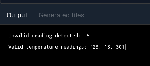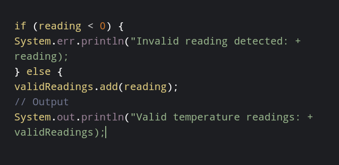 Program detects a faulty sensor, logging error messages and tries to process the rest of readings. List of temperature readings are created and also a list to hold valid readings. We loop through each elements, invalid readings, log error message as well as know. Using try-catch block, program stands to be able to handle invalid reading, logs the error and continue running.
