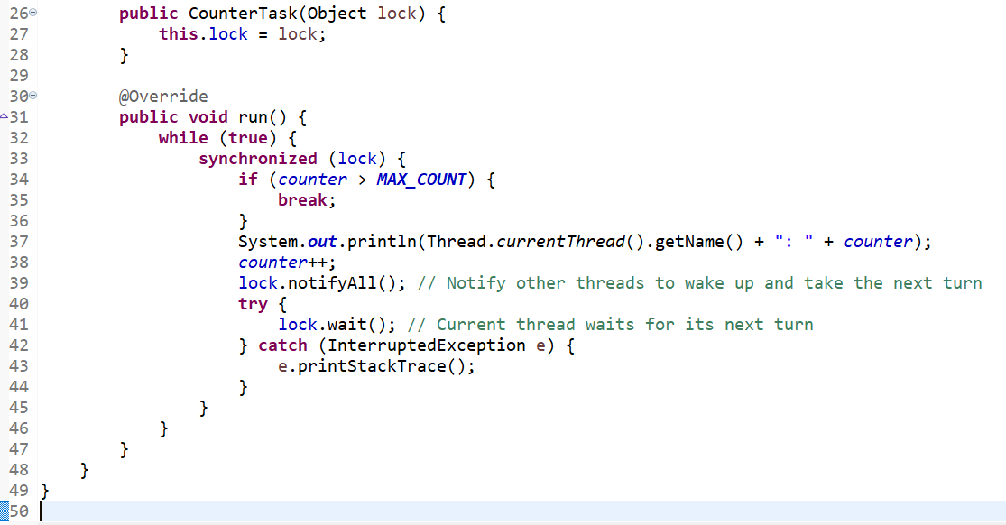 notifyAll(): After printing the first counter, it then calls notifyAll() the threads to shake up the next thread waiting and try to acquire the lock or continue the count.
