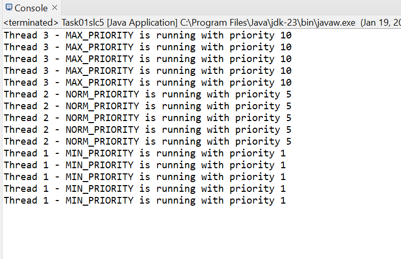 | Write a program that demonstrates how thread priorities affect execution order. Create three threads and assign them the priorities MIN_PRIORITY, NORM_PRIORITY, and MAX_PRIORITY. Run the threads and observe the execution order. Explain whether the thread priority influences their execution order and why. |