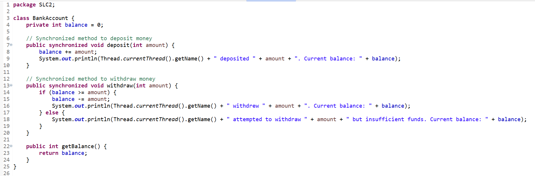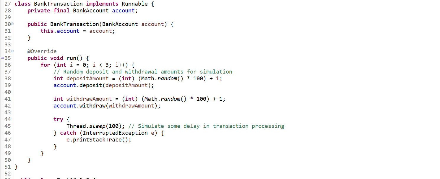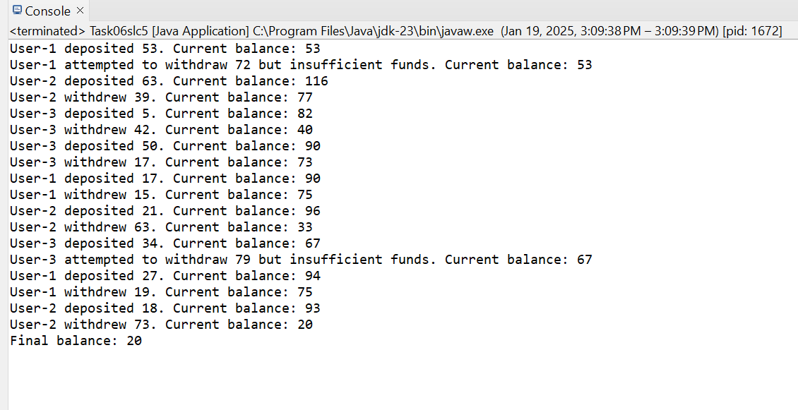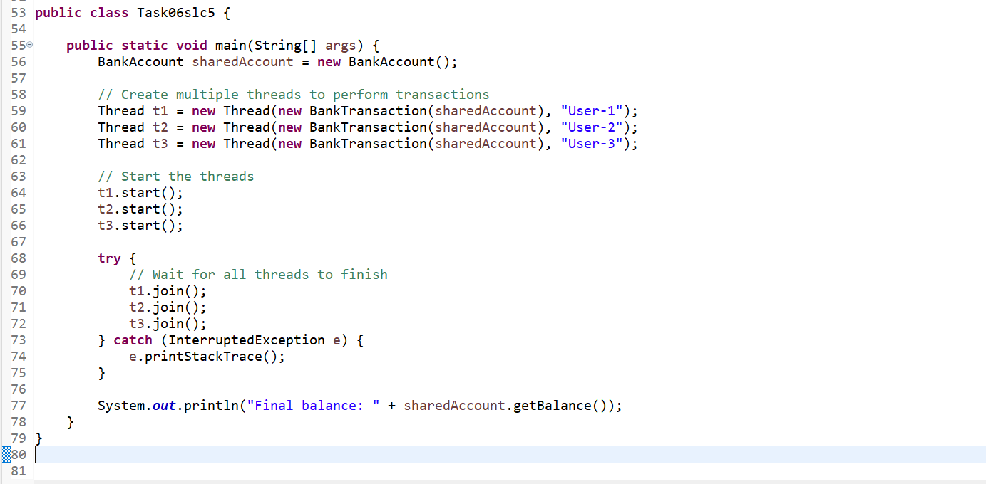 Thread Coordination: Thread.sleep(100) simulates delays in between transactions so that it is easy to observe synchronization during them. Join() ensures that the main thread waits for all subordinate threads to finish before printing the final balance.