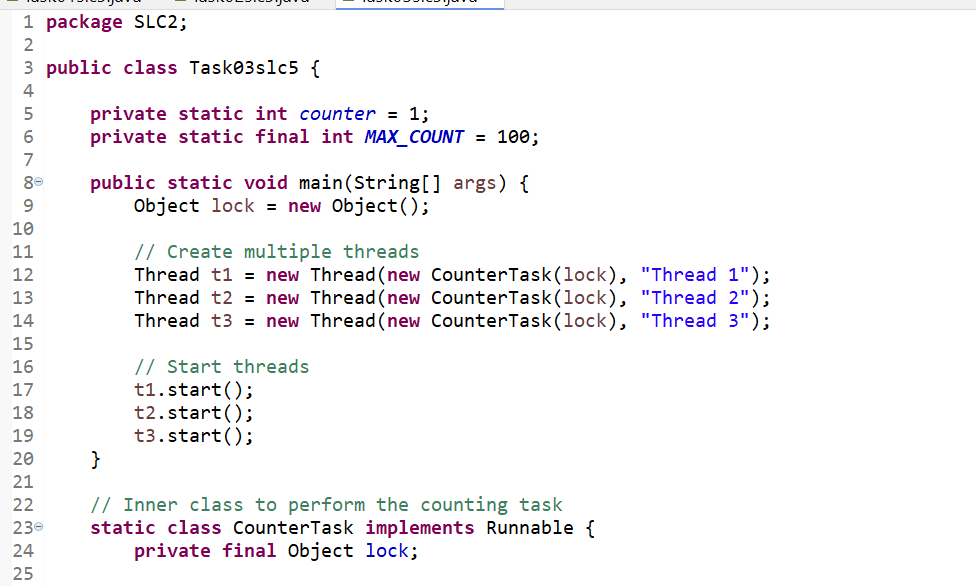 Synchronization: First, to access the counter, we use an object called a lock. This allows us to synchronize shared resources. The advantage of this is that it ensures that only one thread counter value is updated or printed at a time.
