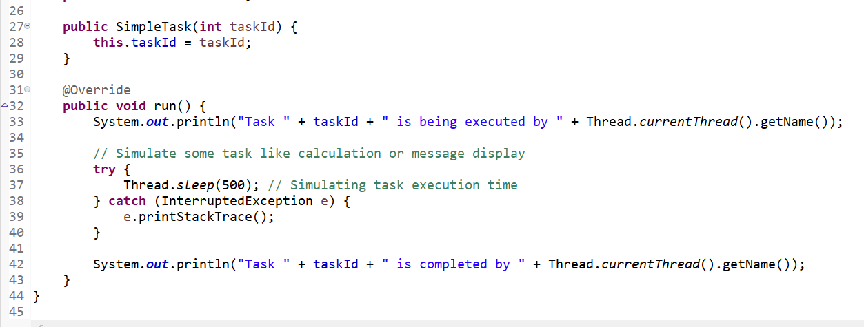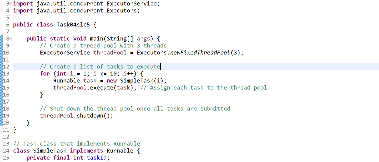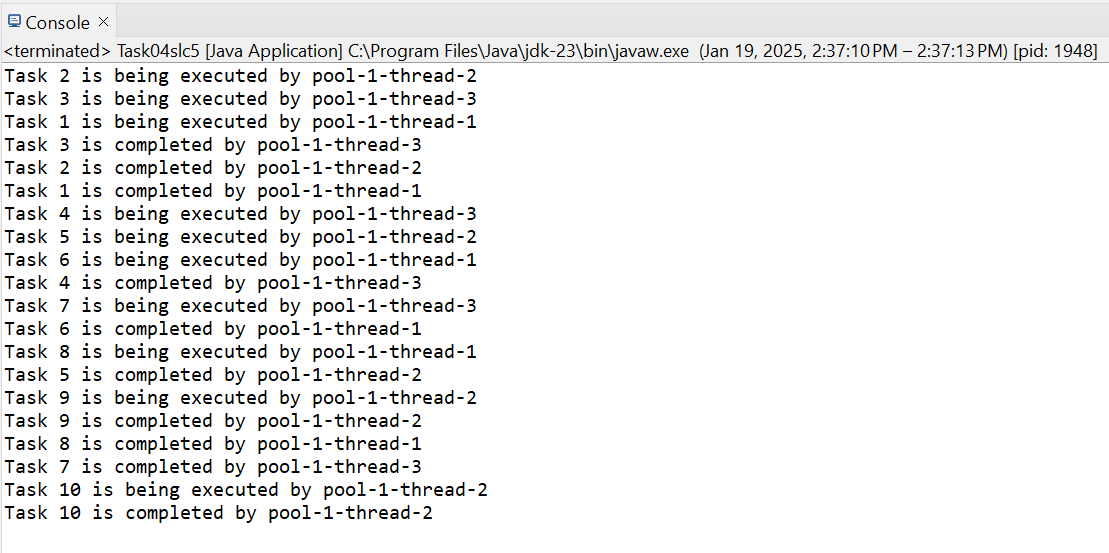 Reusability of Threads: Thread pools are created with three threads using Executor.newFixedThreadPool(3). We will no longer need to create a new thread for each task. These three threads will handle multiple tasks. When the work of one thread is completed, then we will not create another thread, but it will become available for the next one without creating a new one.