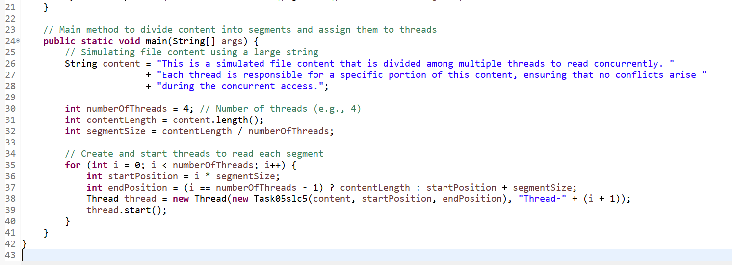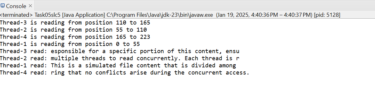 | Write a program where multiple threads read different parts of a file simultaneously. Divide the file into distinct segments, assign each segment to a thread, and print the content read by each thread. Explain the logic used for dividing and assigning file segments to avoid conflicts and ensure efficiency. |