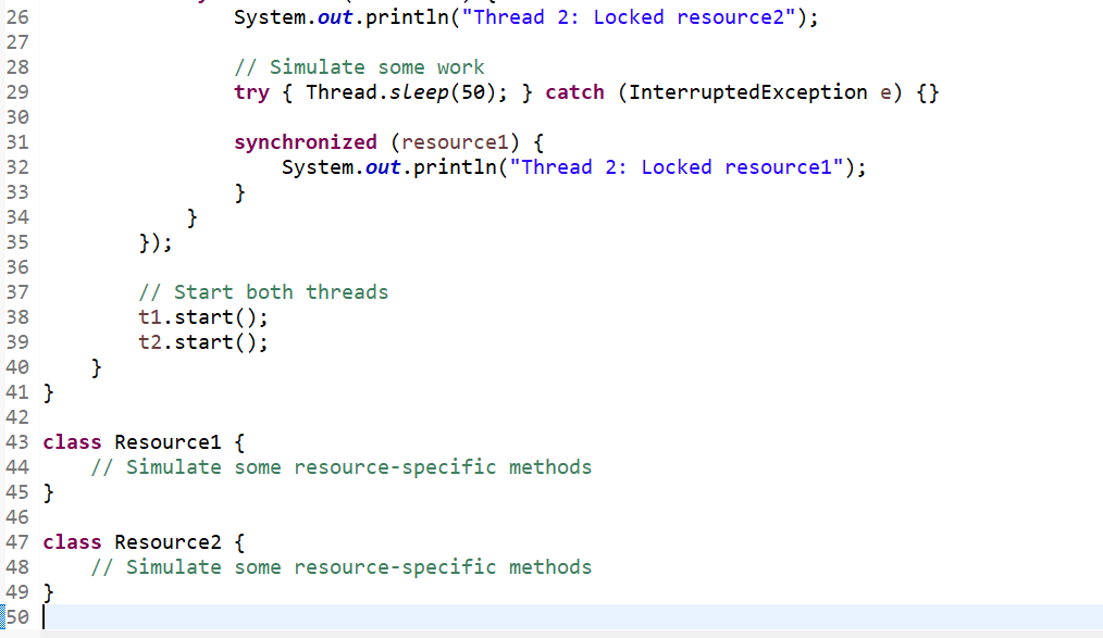 Lock Ordering: To avoid circular dependencies, we need to ensure that both of our threads acquire locks in the same order, such that the first thread should lock resource one, and then resource two.