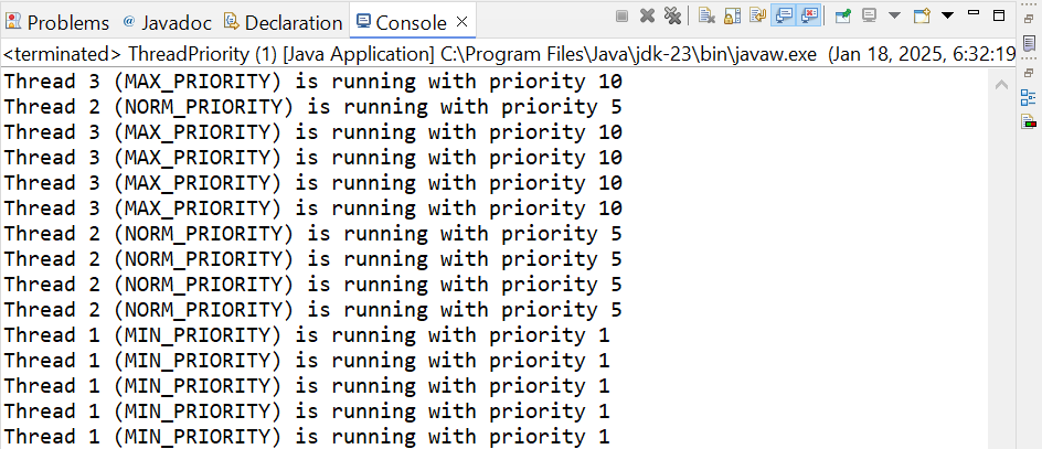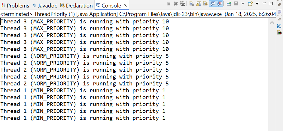 This is the output of this program. In this output the execution shows the program is following the priority order of the threads defined in the program. It is visible that first 5 lines were printed with the maximum priority which is 10 and then the normal priority threads are printed in the next 5 lines whose priority is 5 and at the end of the normal priority the threads of the minimum priority are executed as the lines show the threads with the minimum priority which is 1.