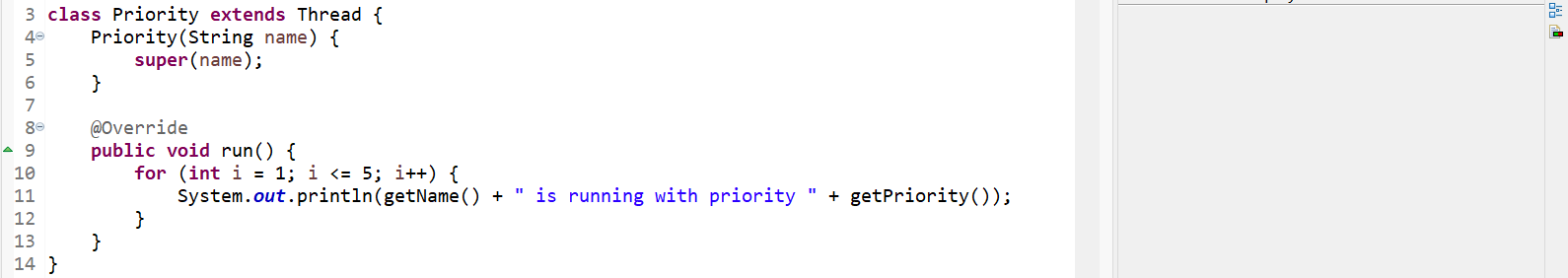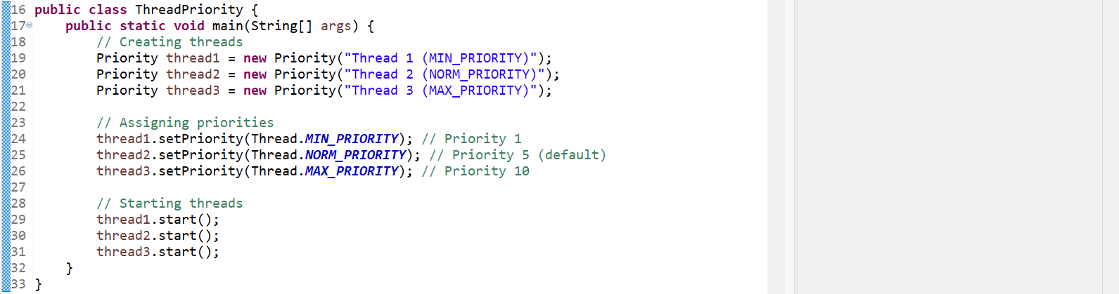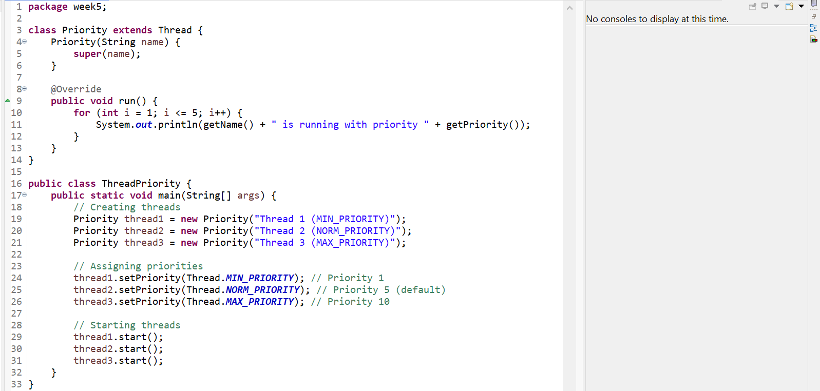 This class extends the Thread class, enabling it to define custom behavior for each thread. The constructor takes a thread name as an argument, which is passed to the superclass constructor to name the thread. The run method is overridden to define the actions the thread will perform when executed. It prints out the name of the thread and its priority in a loop for better visibility.