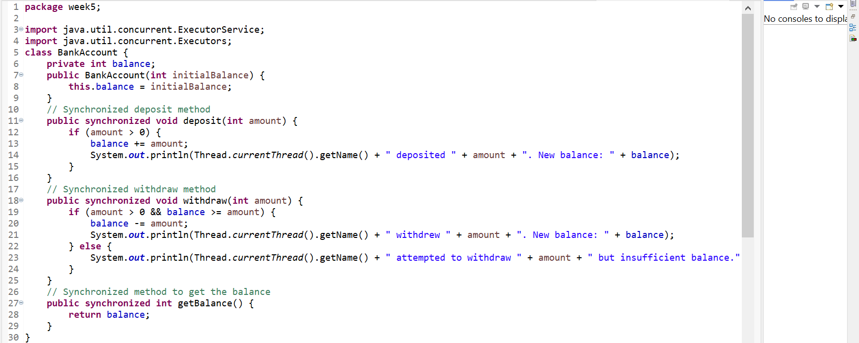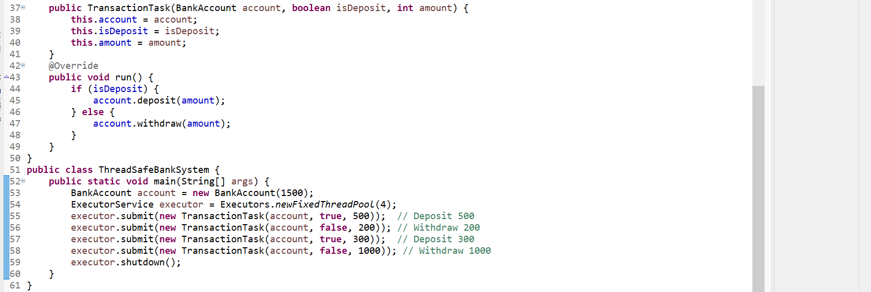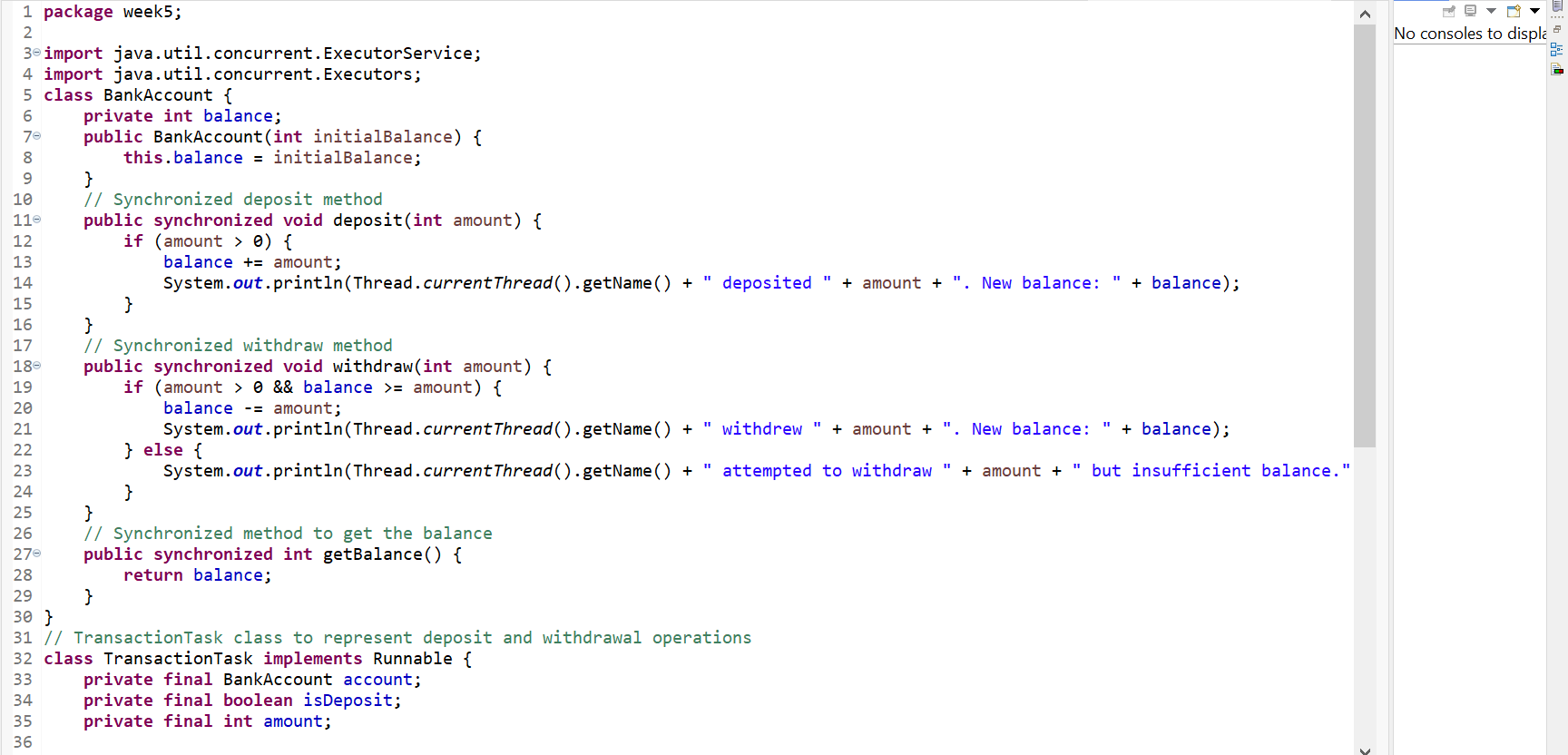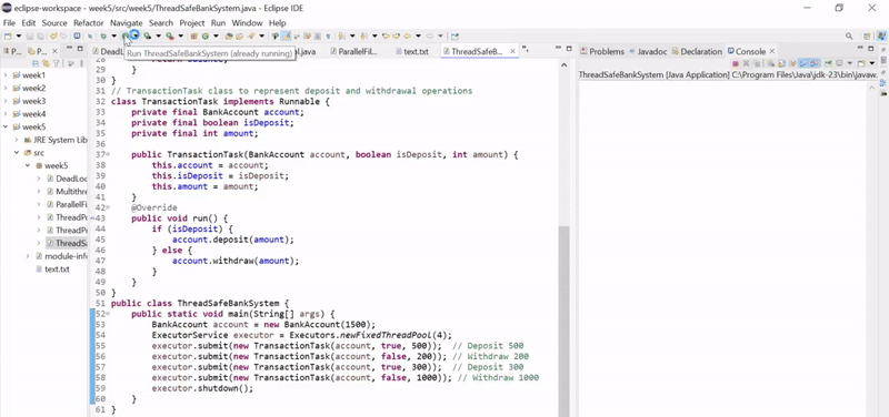 This program demonstrates a thread-safe bank transaction system in which multiple threads operate on shared resources without conflicts. Such synchronization ensures atomicity, consistency, and correctness in a multi-threaded environment. This kind of design is suitable for real-world applications requiring concurrent access to shared resources.