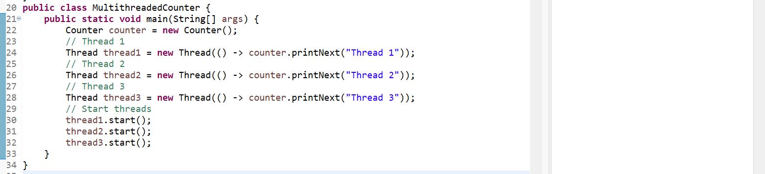 Each thread is created using a lambda expression which calls the printNext method with its name as argument. The threads are then executed concurrently by invoking the start method. Note that even though the threads execute in parallel, the synchronized keyword on the Counter class ensures only one thread may print a number at a time.