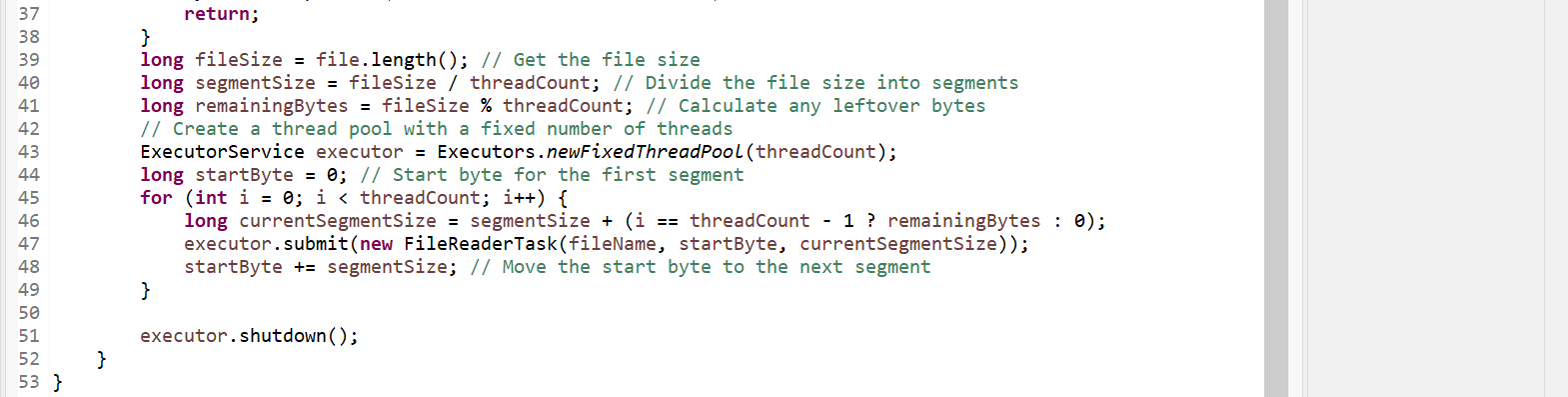forloop, and aFileReaderTaskis created for each segment by passing the start byte and size. These tasks are submitted to the thread pool for execution. - Dynamic Adjustments: The last thread reads any remaining bytes by adding