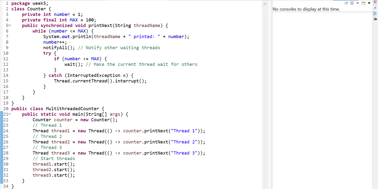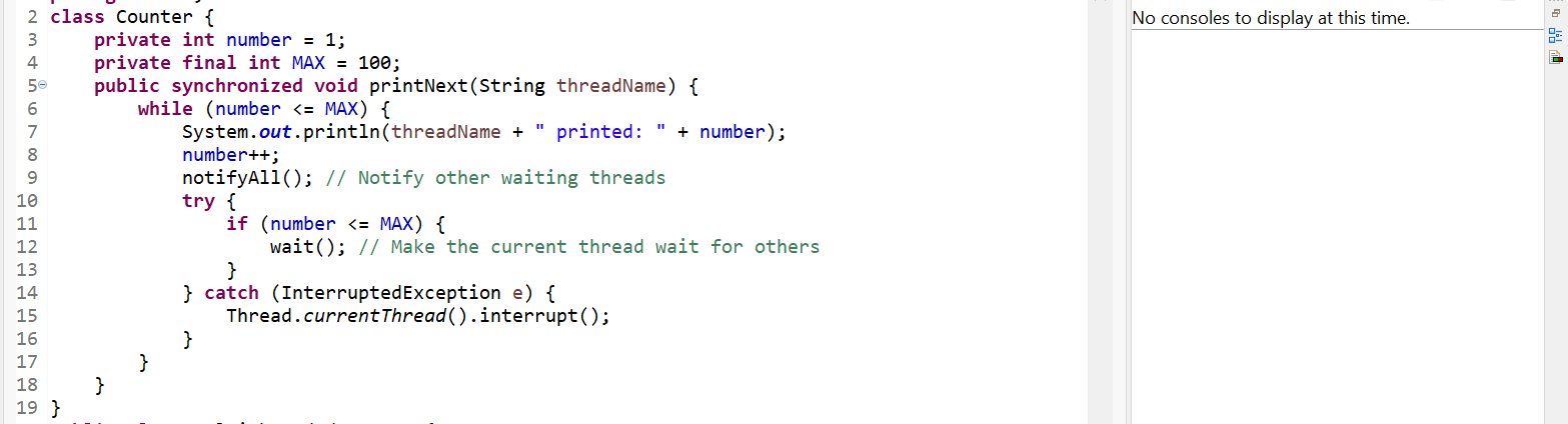 waitandnotifyAllare used to coordinate the execution of threads. When a thread finishes printing, it callsnotifyAllto wake up other threads waiting for the lock. Then, the thread callswaitto release the lock and allow another thread to proceed.Shared Counter Object: