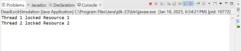 Deadlock occurs since Thread 1 holds resource1 and waits for resource2 while Thread 2 holds resource2 and waits for resource1. No any thread can continue as the lock it requires is held by the other thread. This gives rise to a kind of circular dependency where both threads will wait indefinitely. And this situation is known as the deadlock.