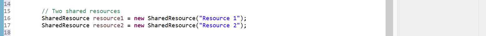 The main method creates two shared resources, resource1 and resource2, which will be locked by two threads in reverse order to simulate a deadlock. The resources are instances of the SharedResource class: