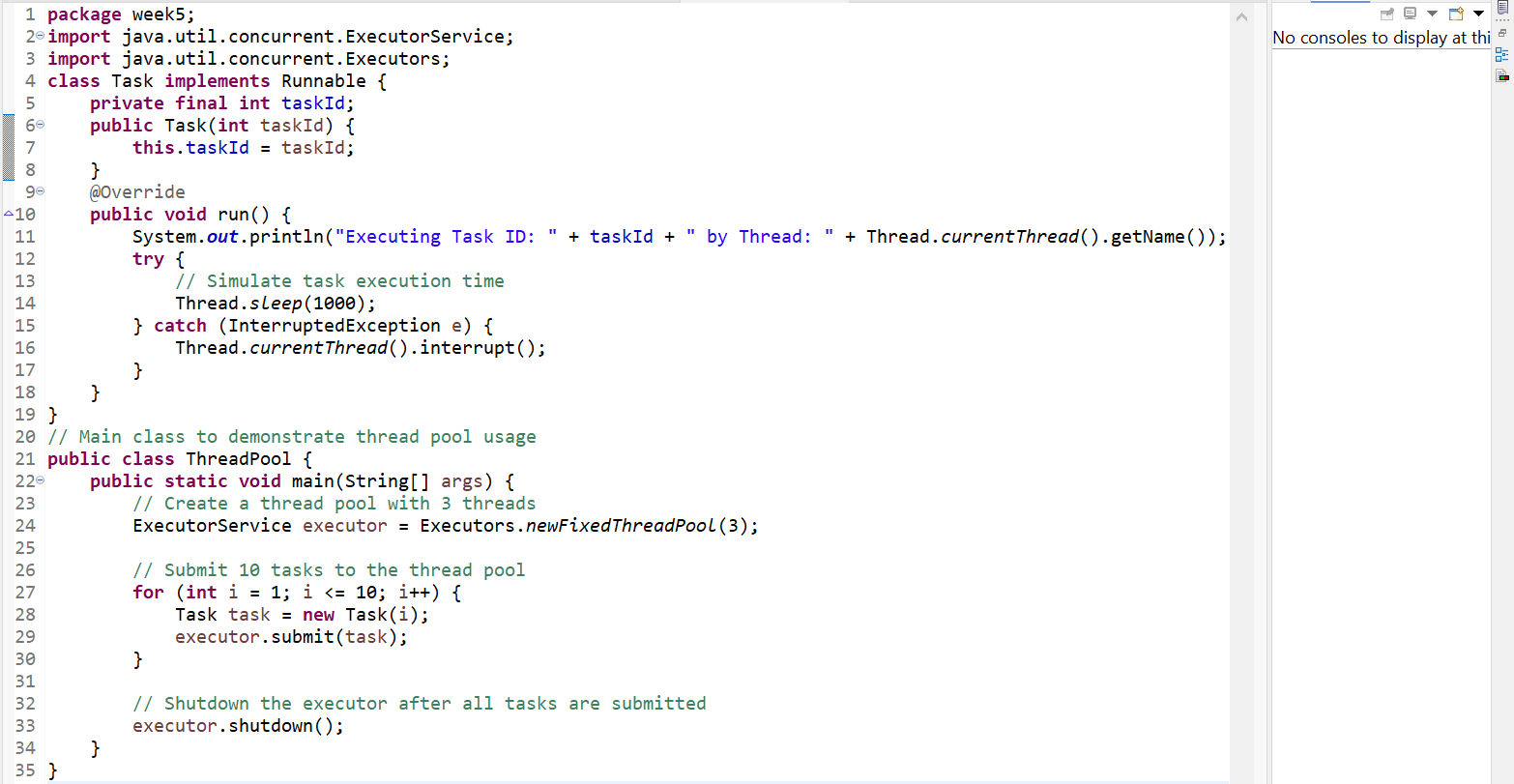 In this output you can see that the tasks are assigned to the threads in the pool, and each thread prints its respective task ID. The thread names (e.g., pool-1-thread-1) indicate which thread is executing each task. Because the thread pool has only three threads, they are reused to execute multiple tasks, demonstrating how thread reuse optimizes performance.