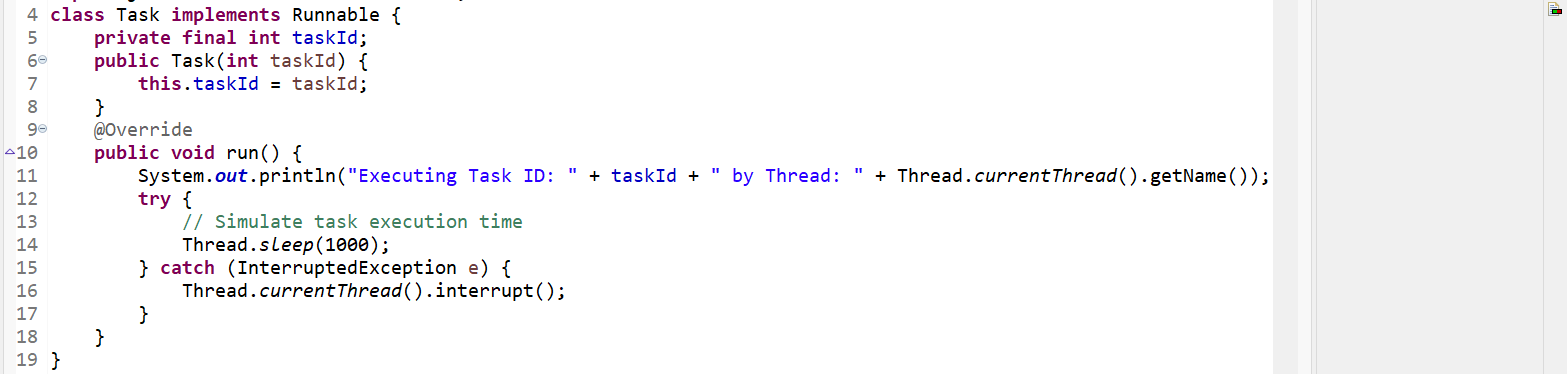 In the following Task class, there is taskId passed upon instantiation, used in the run method to refer to the task inside the output. The run method will mimic task execution using Thread.sleep(1000) whereby the task spends one second performing some kind of time consuming work. An exception of type InterruptedException was caught and allowed for safe response from the thread for an interruption request. Good practice for long running threads.