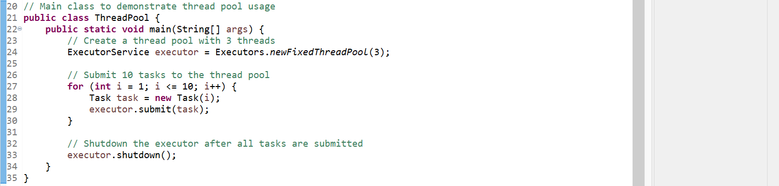 Executors.newFixedThreadPool(3). Only three threads will be active at any given time, regardless of how many tasks are submitted. - Task Submission The